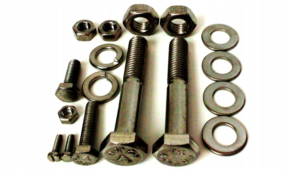 Комплект состоит из хромоникелевых элементов из нержавеющей стали, выполненных класса А2 70. В комплект входят винты, винты, гайки и шайбы, разделенные на 10 отдельно упакованных групп, что позволяет без проблем собрать отдельные элементы мопеда. Дополнительно в группу РУЛЕВ добавлены два винта М10 из мелкой стали с оцинкованным покрытием класса 10,9. В группе КОЛЕСА в комплект входят винты, гайки и шайбы для крепления звездочки заднего колеса. Добавленные стальные винты М7 оцинкованы до класса 8,8.