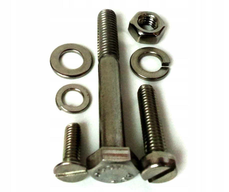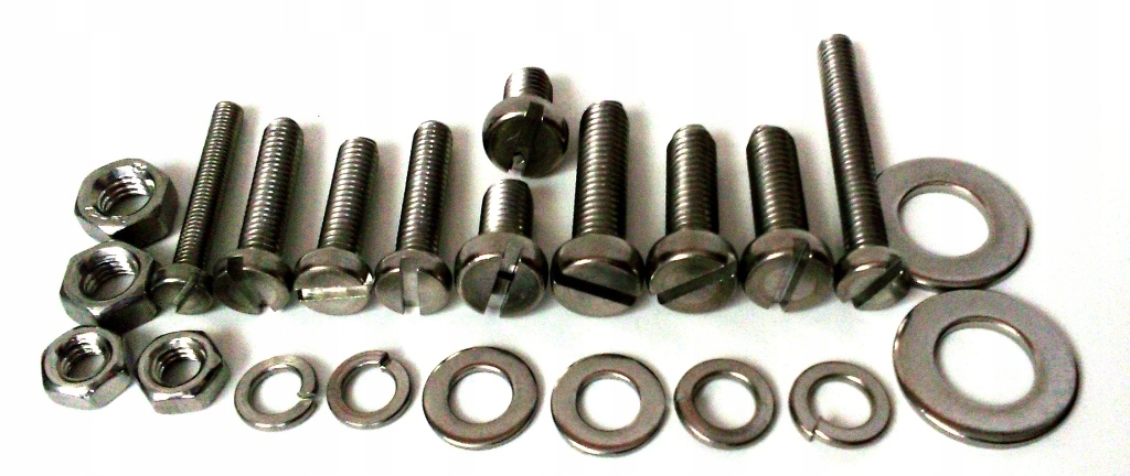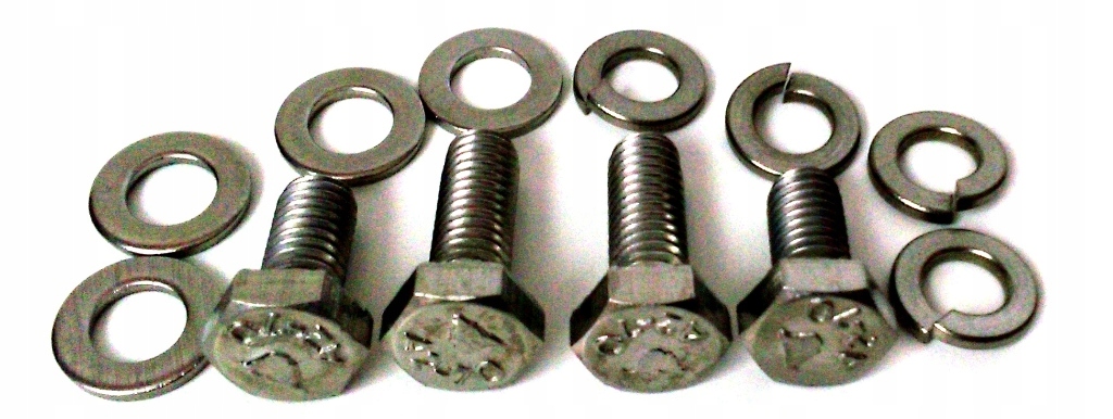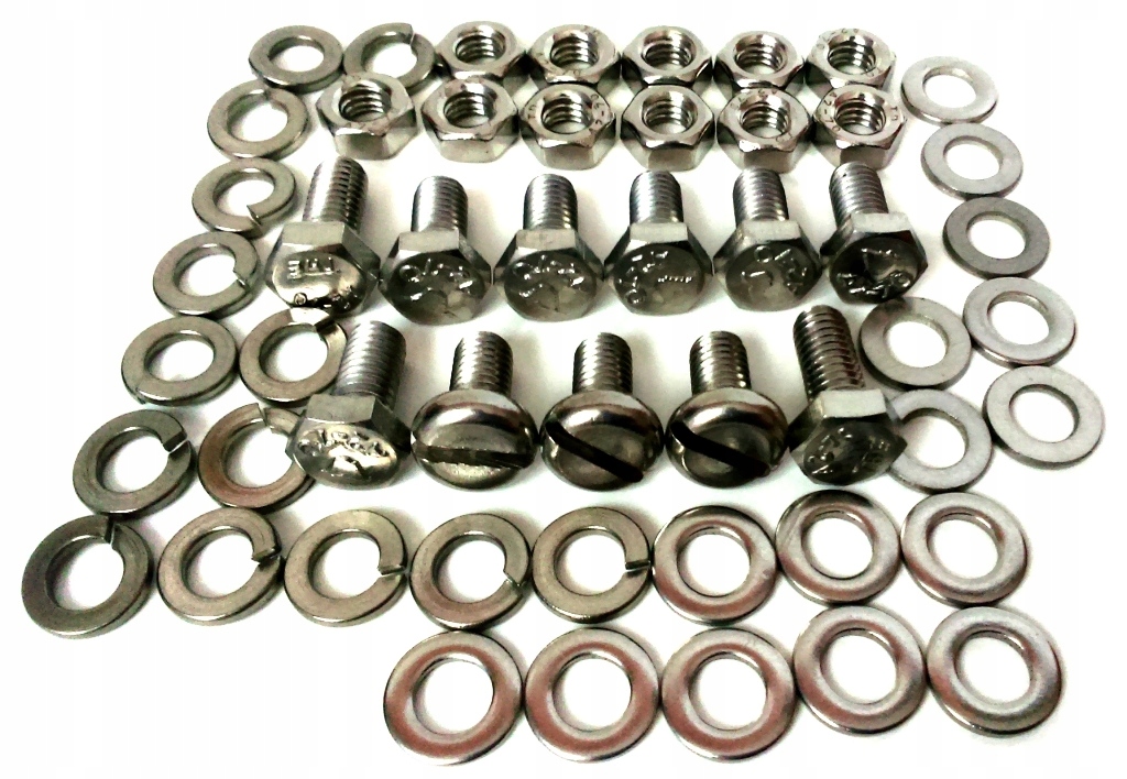 Комплект состоит из хромоникелевых элементов из нержавеющей стали, выполненных класса А2 70. В комплект входят разделенные винты, винты, гайки и шайбы. на 10 отдельно упакованных групп, что обеспечивает беспроблемную сборку отдельных компонентов мопеда. Дополнительно в группу РУЛЕВ добавлены два винта М10 из мелкой стали с оцинкованным покрытием класса 10,9. В группе КОЛЕСА в комплект входят винты, гайки и шайбы для крепления звездочки заднего колеса. Добавленные стальные винты М7 оцинкованы до класса 8,8.