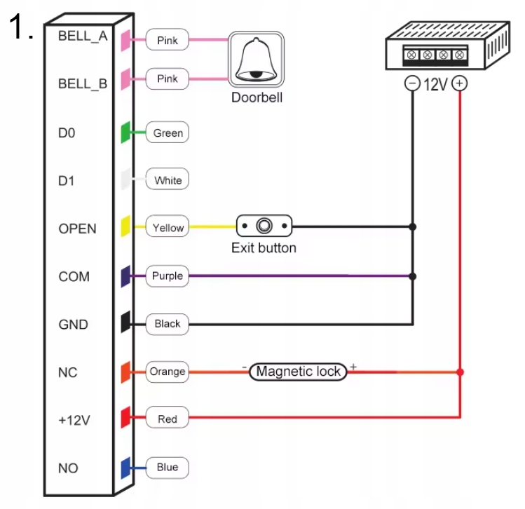 - Красный провод подает питание 12 В на устройство или замок.