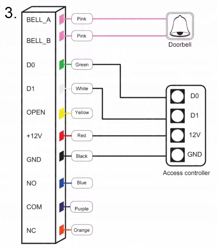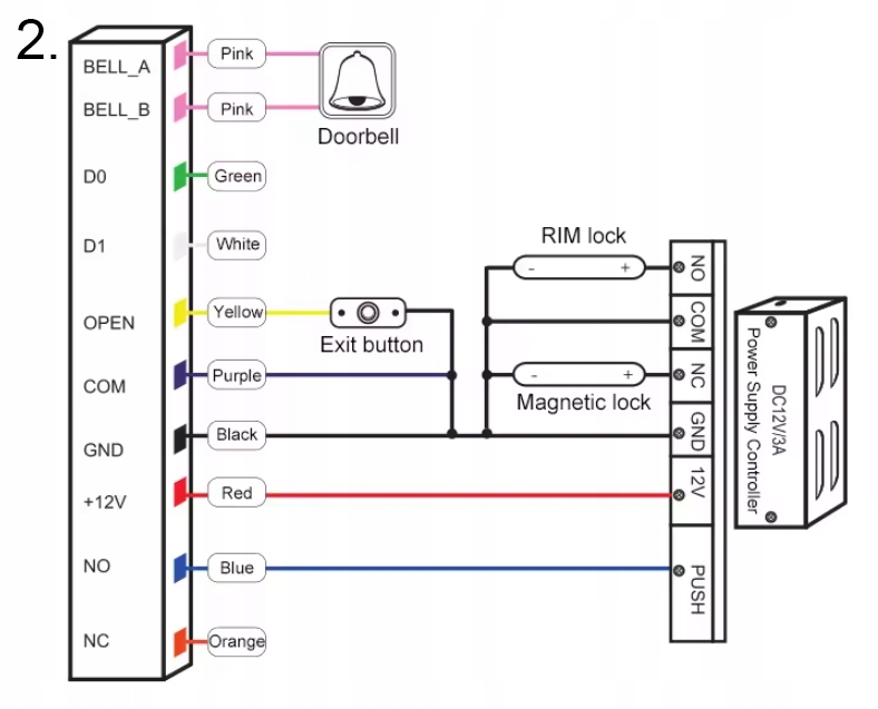 - Оранжевый провод (NC) используется для магнитных замков, требующих постоянного питания (нормально закрытый).