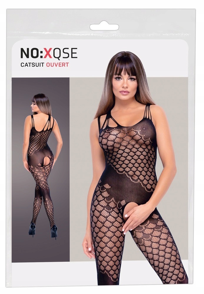 Стильный комбинезон от NO:XQSE с мелкой сетчатой структурой и замысловатым графическим узором.