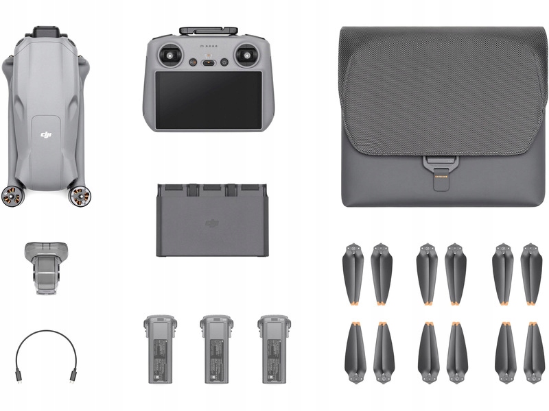 В комплект поставки входят: дрон DJI Air 3, шесть пар пропеллеров, крышка подвеса, контроллер DJI RC 2, хаб с разъемом USB-C для зарядки. аккумуляторы, кабель USB-C — USB-C, три аккумулятора, сумка через плечо и документация.