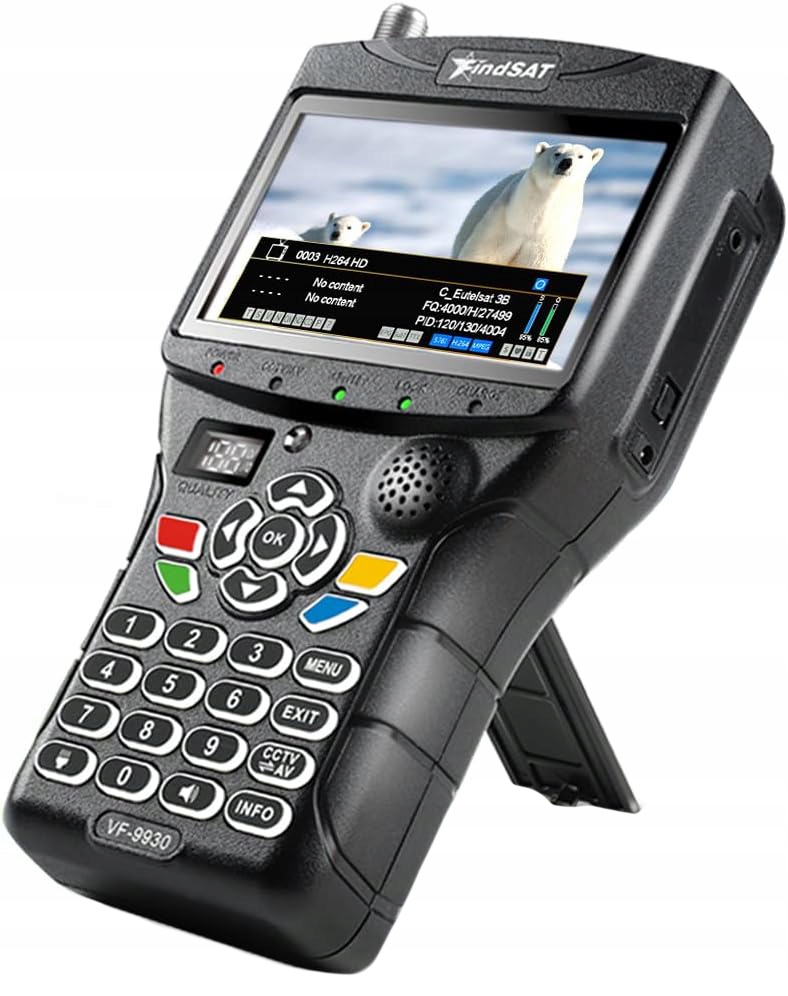 - Наземный счетчик цифрового сигнала, оснащенный 4,3-дюймовым ЖК-экраном высокого разрешения (Dots Piexls 800 x 480), видео поддержка и живая телевизионная программа, которая поддерживает мощный дисплей в реальном времени. Спутниковая поисковая система с освещенными клавишами облегчает работу при слабом освещении.