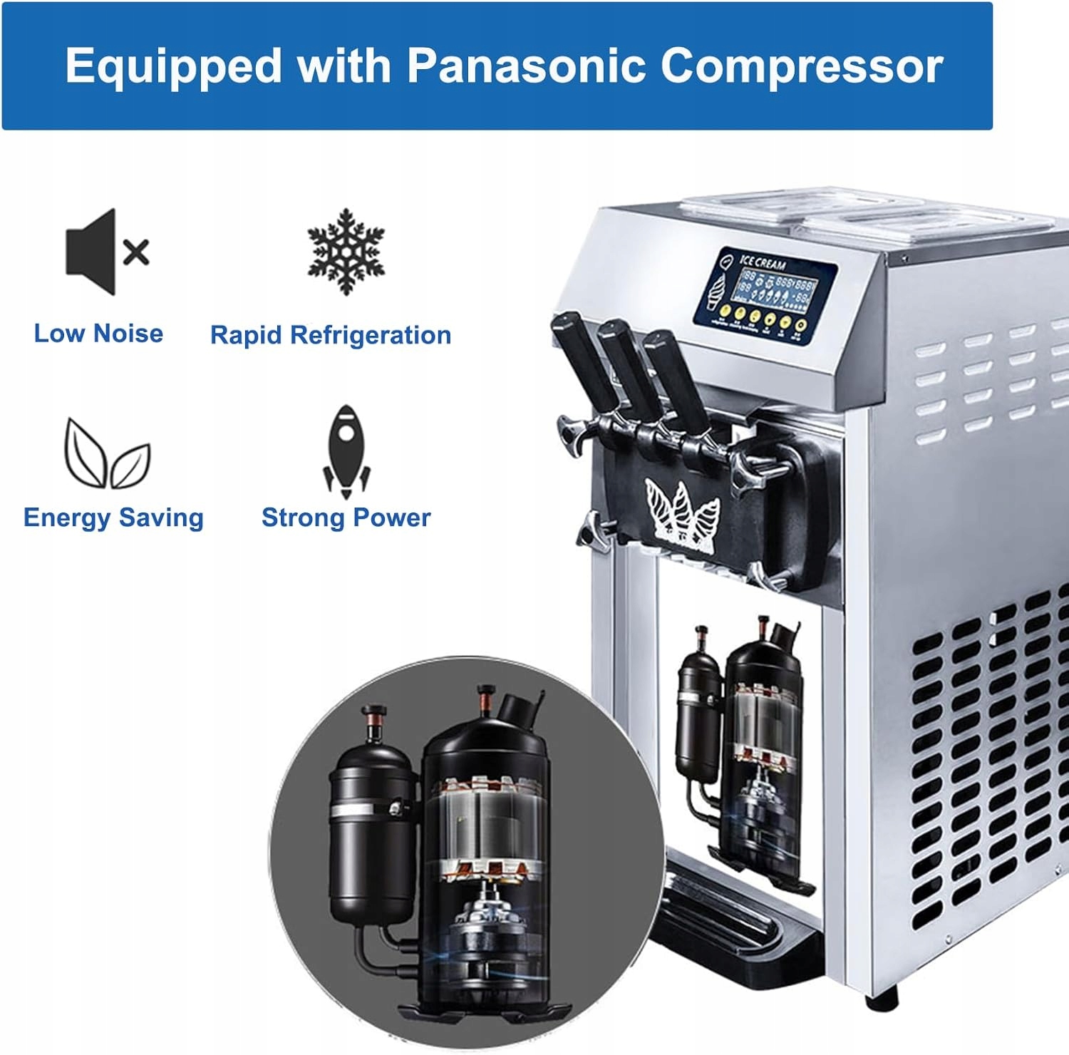 Мощная производительность】 Компрессор знаменитого бренда 1250 Вт достигает быстрого охлаждения и быстрого разряда при низком шуме во время работы, обеспечивая непрерывную и длительную мощность для мягкого мороженого. С 4 резиновыми опорами ноги могут эффективно предотвратить скользкие.