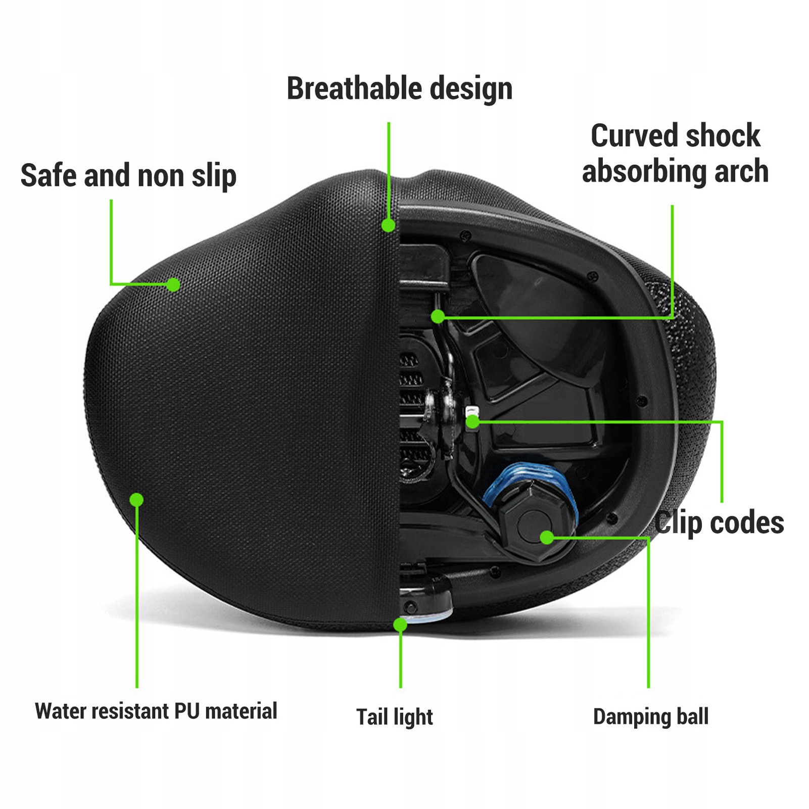 1. Водонепроницаемость долговечности: велосипедная подушка изготовлена из водонепроницаемой кожи ПУ, идеально подходящей для любых погодных условий. Он устойчив к поглощению грязи и легко чистить, гарантируя, что седло остается аккуратным и чистым.