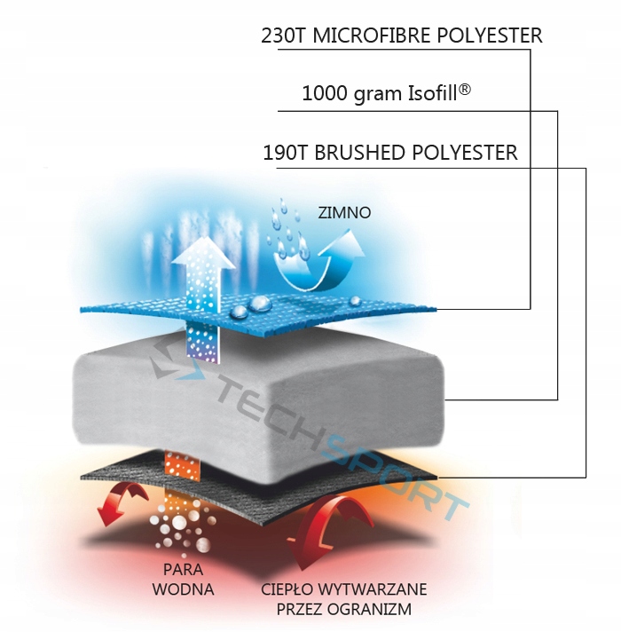 - внешний слой - МИКРОФИБРА ПОЛИЭСТЕР 230Т - материал, выделяющий водяной пар и непроницаемый для холода и влаги.