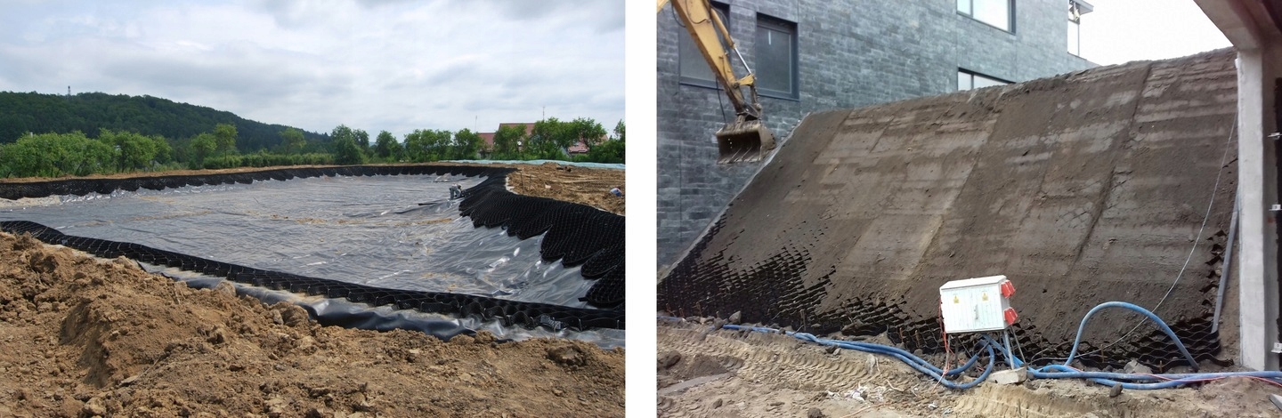 Материал, заключенный внутри ячеек, создает особую пространственную ячеистую структуру, снижающую воздействие эрозии.
