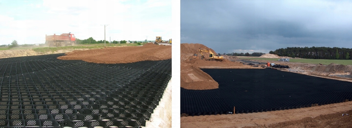 Ячеистая георешетка – изделие, решающее проблему плохой несущей способности родного грунта. Его эффект заключается в уменьшении вертикальных напряжений за счет создания основания, которое ведет себя как полужесткая плита.