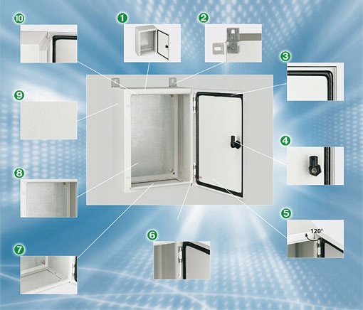 Стальной лист толщиной 1,2 мм и толщиной 1,5 мм для распределительные щиты размером 400х400. Дверь открывается вправо на угол до 120°.Легкий демонтаж петель позволяет установить дверь на правую или левую сторону. Петли спрятаны в корпусе. Герметичность корпуса и двери сохраняется благодаря прокладке из полиуретана. Все корпуса имеют профили по вертикальным краям дверей с крепежными отверстиями через каждые 25 мм.
