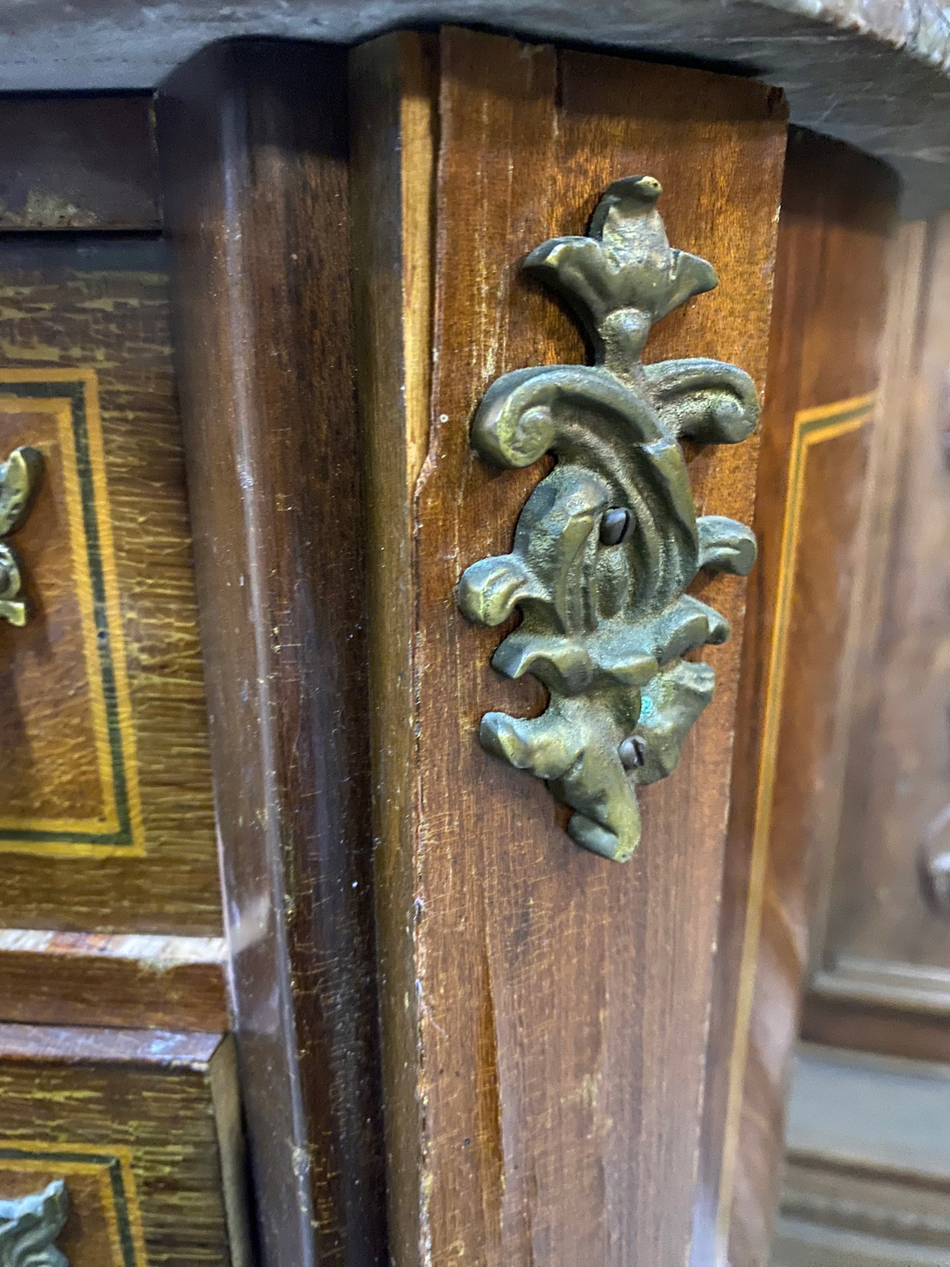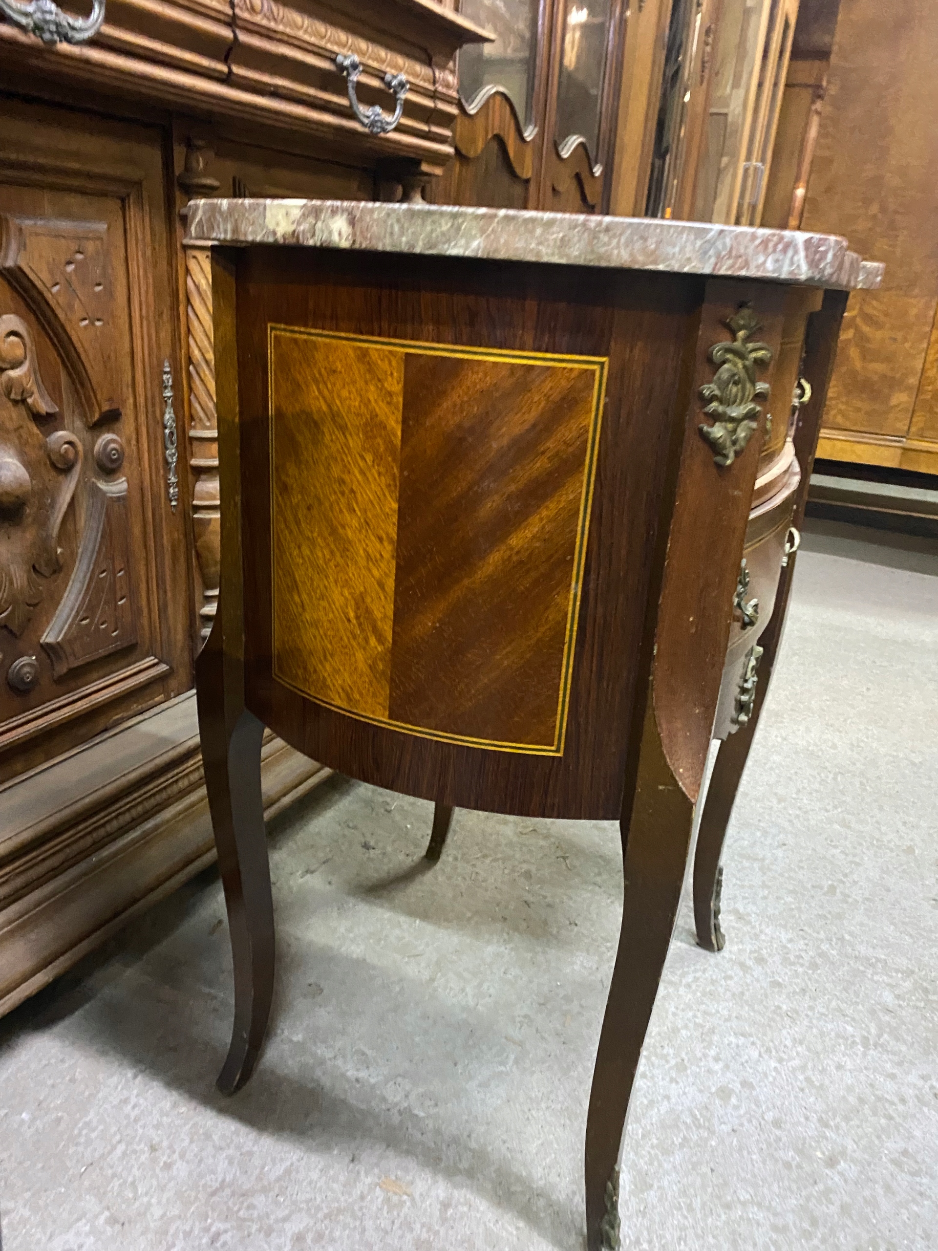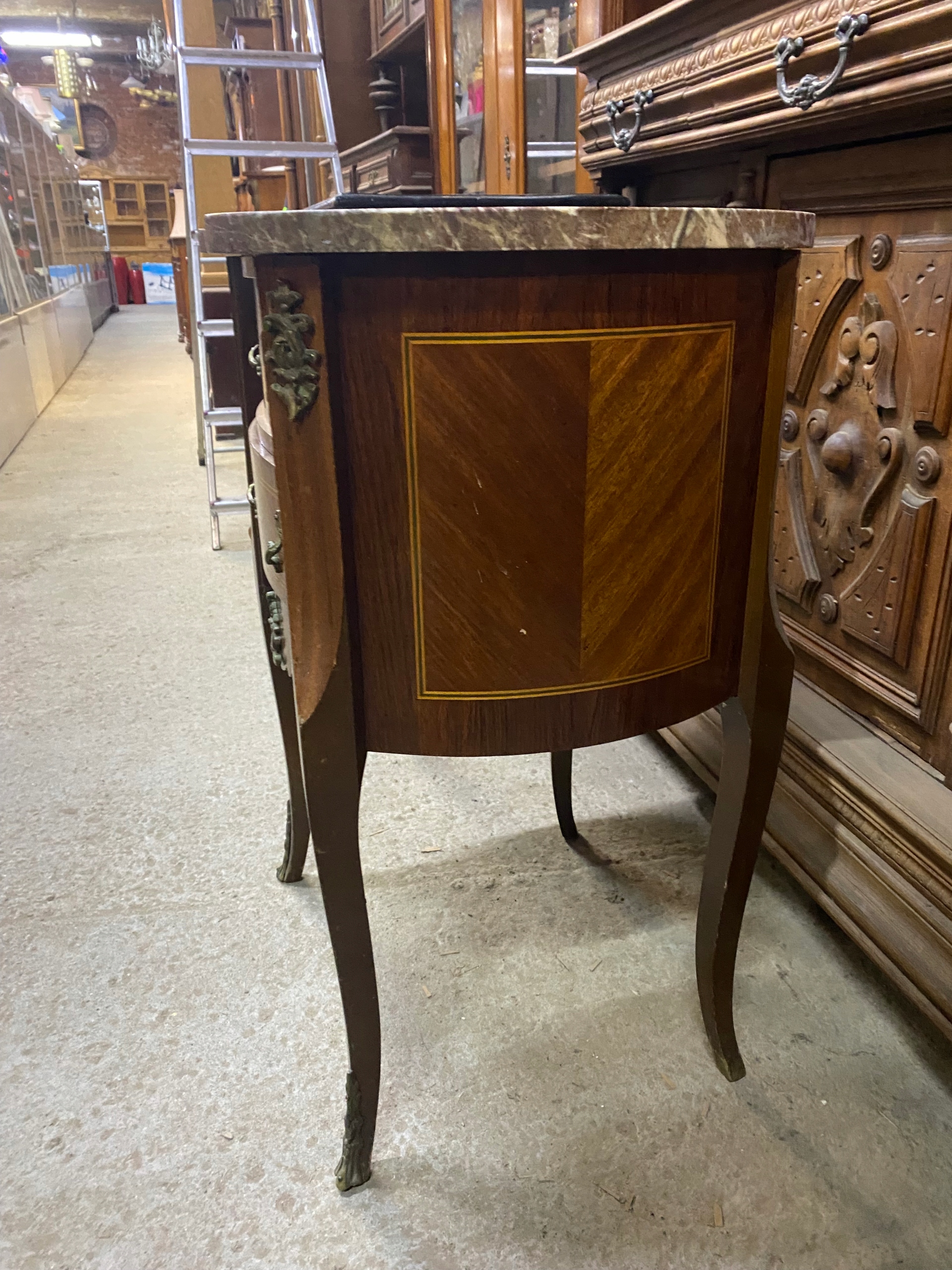 Продается инкрустированный комод из орехового дерева со столешницей из камня. Идеально подходит в качестве подставки для цветов или пьедестала для скульптуры/светильника. Красивые изогнутые ножки. Состояние видно на фото. Под ремонт или использование как есть. Есть царапины, потертости и сколы.