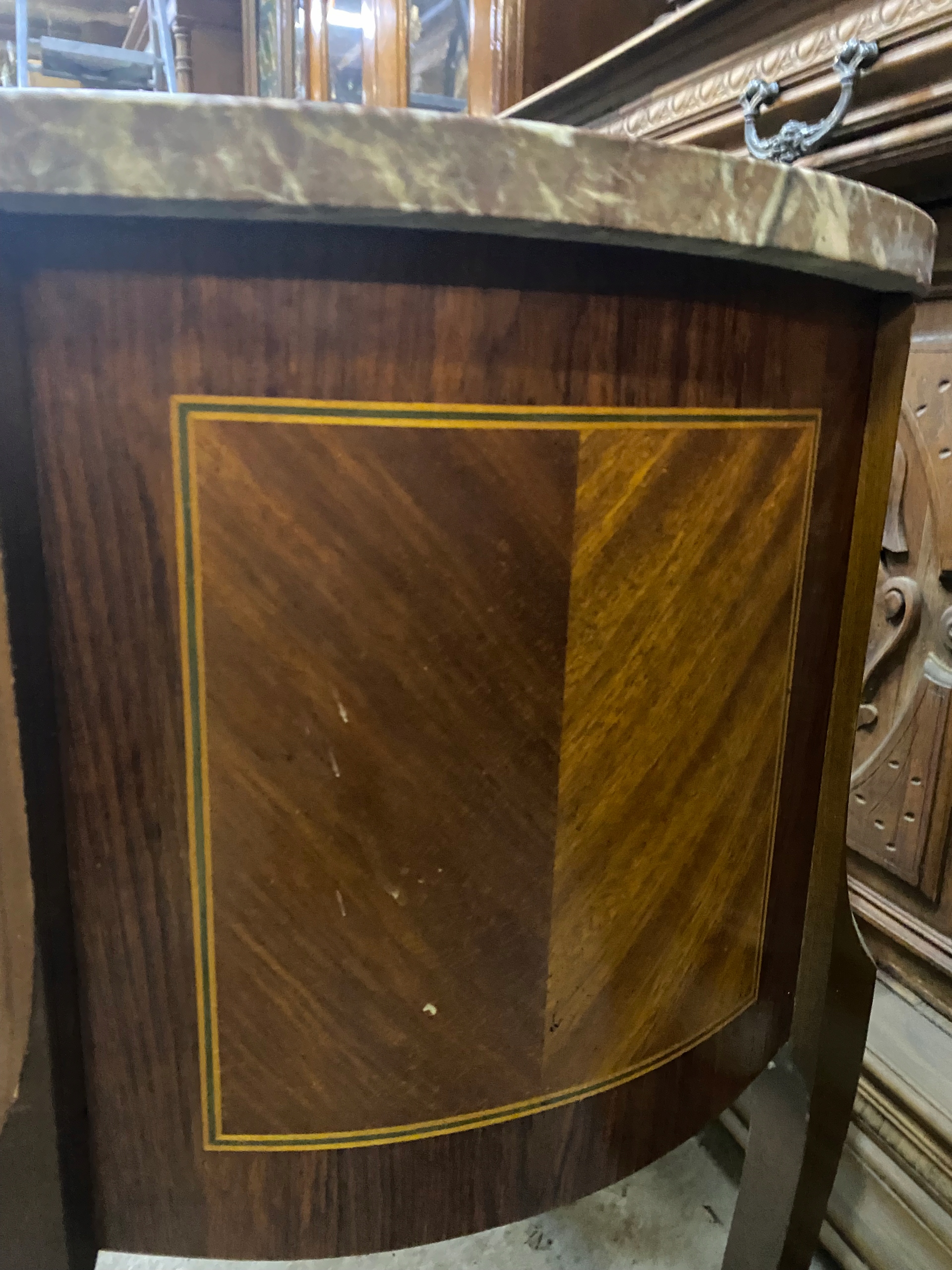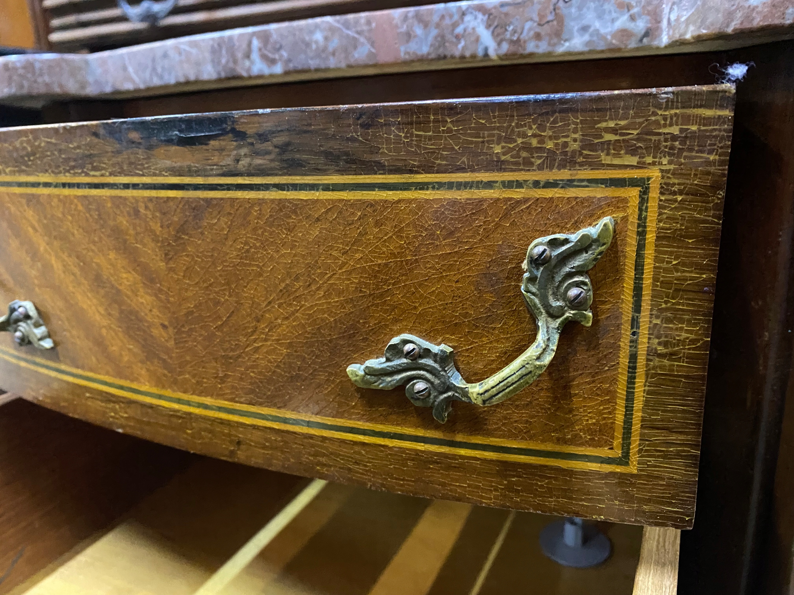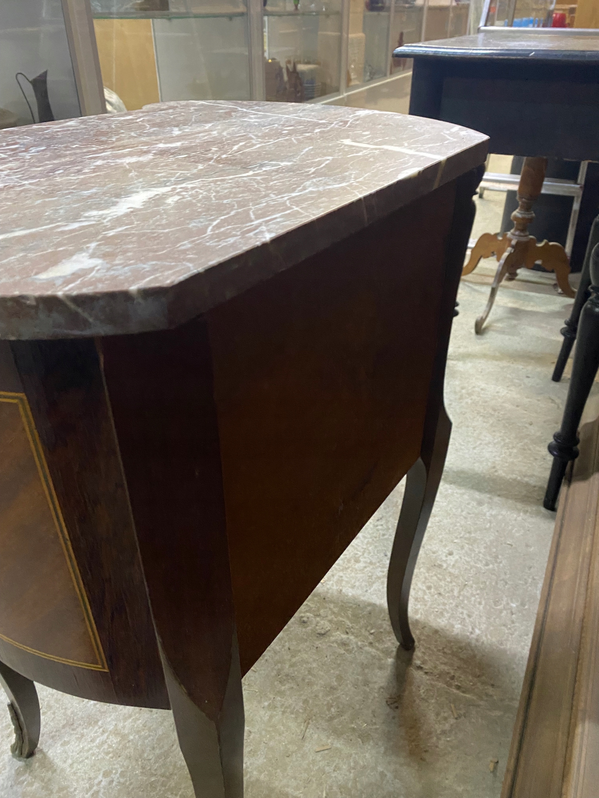 Продается инкрустированный комод из орехового дерева со столешницей из камня. Идеально подходит в качестве подставки для цветов или пьедестала для скульптуры/светильника. Красивые изогнутые ножки. Состояние видно на фото. Под ремонт или использование как есть. Есть царапины, потертости и сколы.