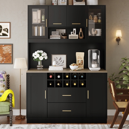 Большая вместимость: отдельно стоящий шестидверный шкаф отвечает различным требованиям к хранению. Кроме того, просторные ящики и винная полка обеспечивают гибкое пространство для хранения различных предметов. Большая плоская столешница на удобной высоте идеально подходит для хранения повседневных предметов или украшений.