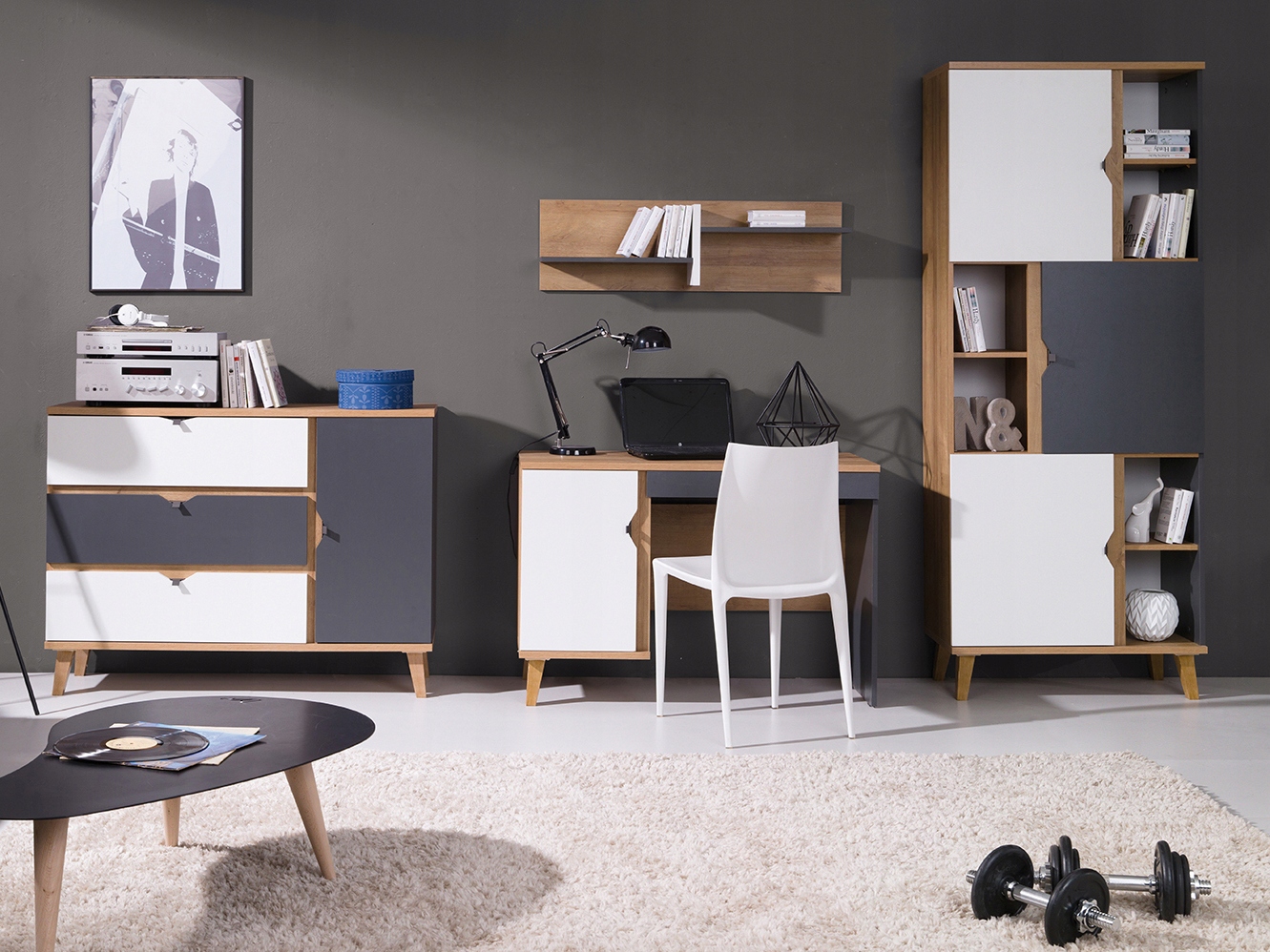 В состав системы входят: шкаф, полки, комоды, тумба под телевизор, письменный стол, тумбочка, кровать, полка.
