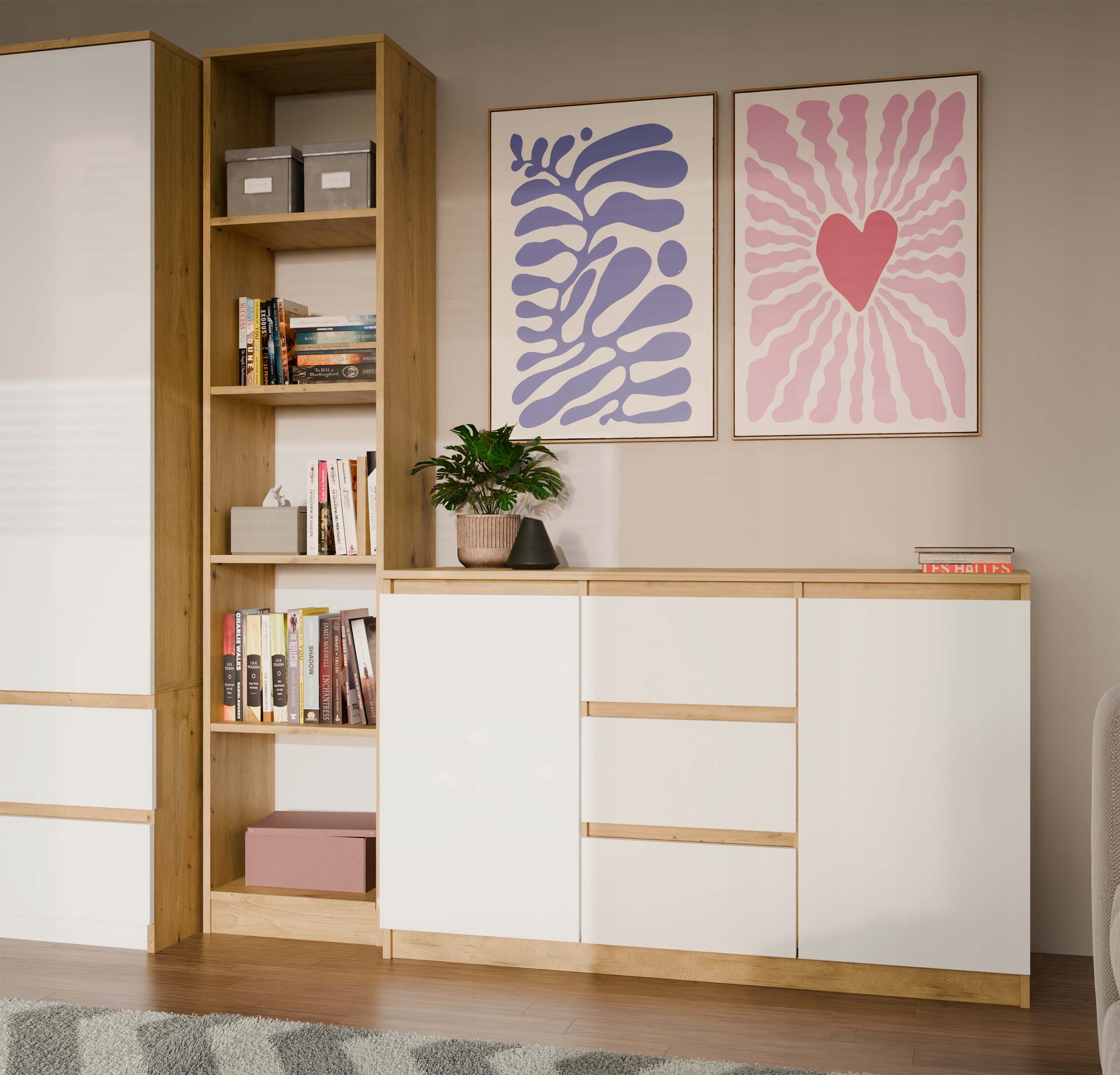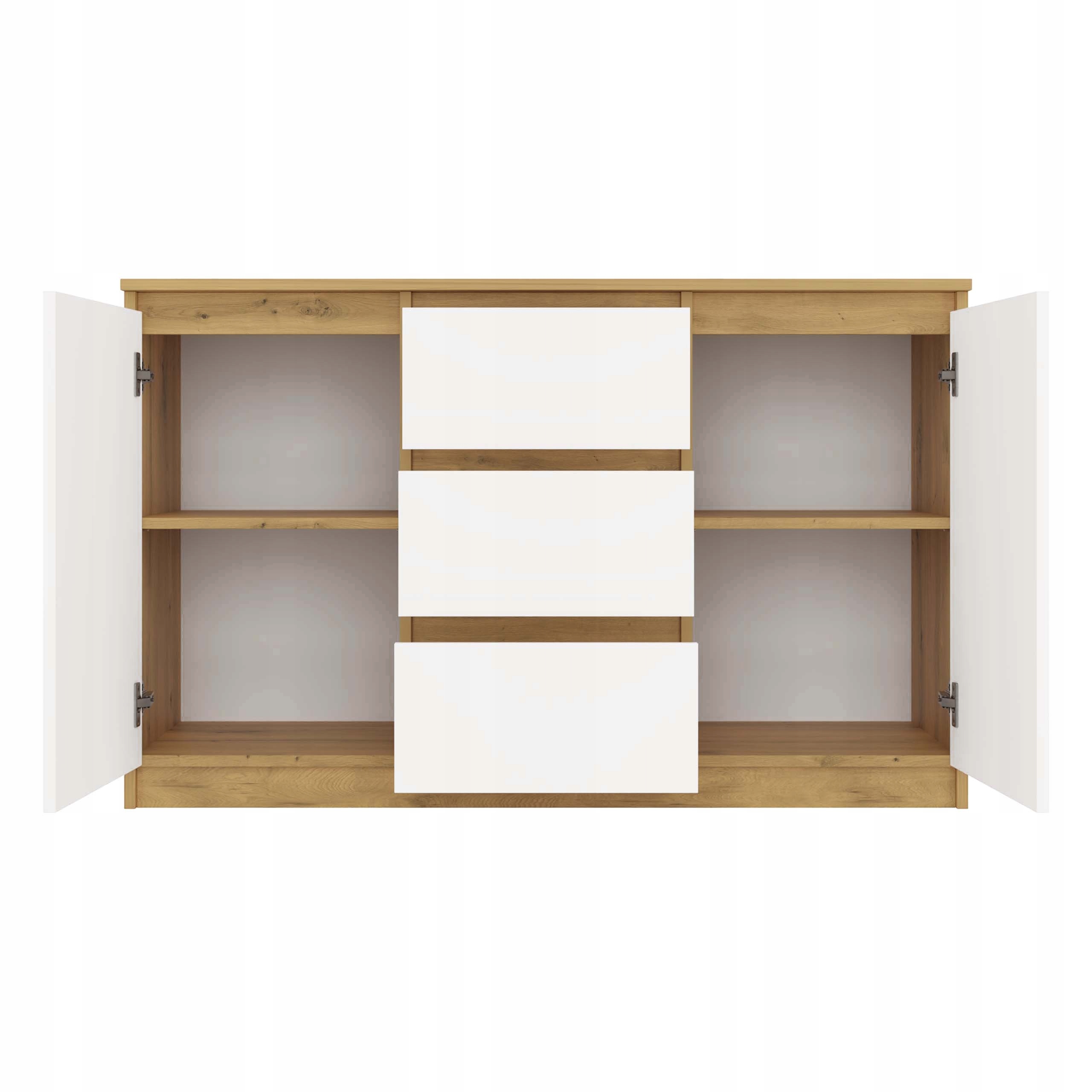 Комод 2D3S — элегантный и функциональный предмет мебели, которая идеально подойдет для гостиной, спальни, прихожей или детской комнаты. Современный элегантный дизайн, сочетающий теплый оттенок дуба Artisan с классическим белым фасадом, придает интерьеру уникальный характер. Сочетание этих двух цветов позволяет комоду идеально вписаться как в современную, так и в более традиционную композицию.