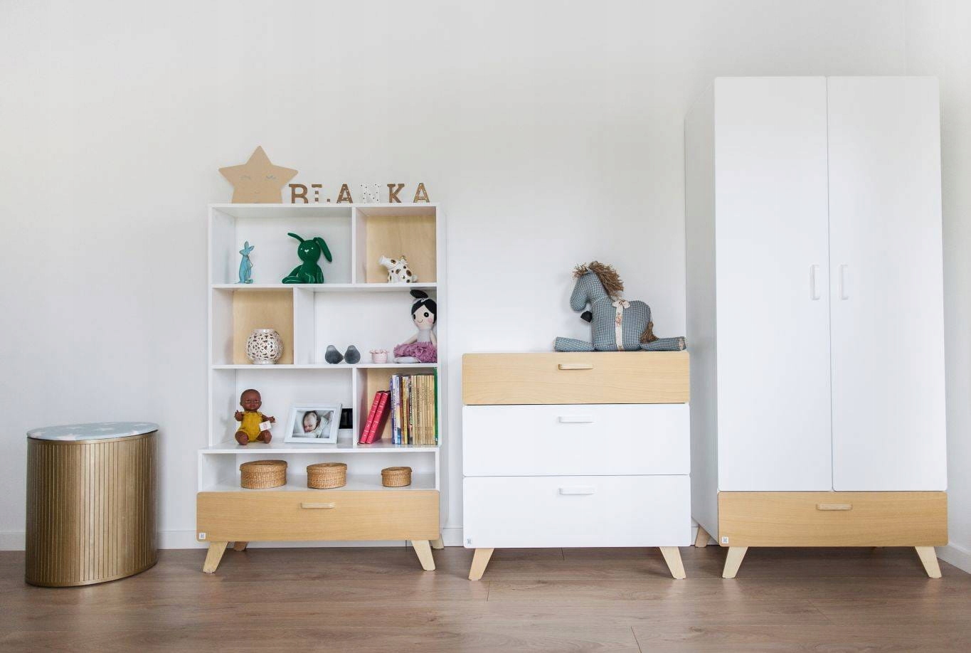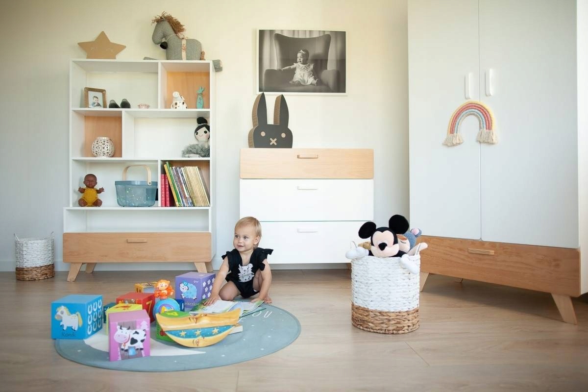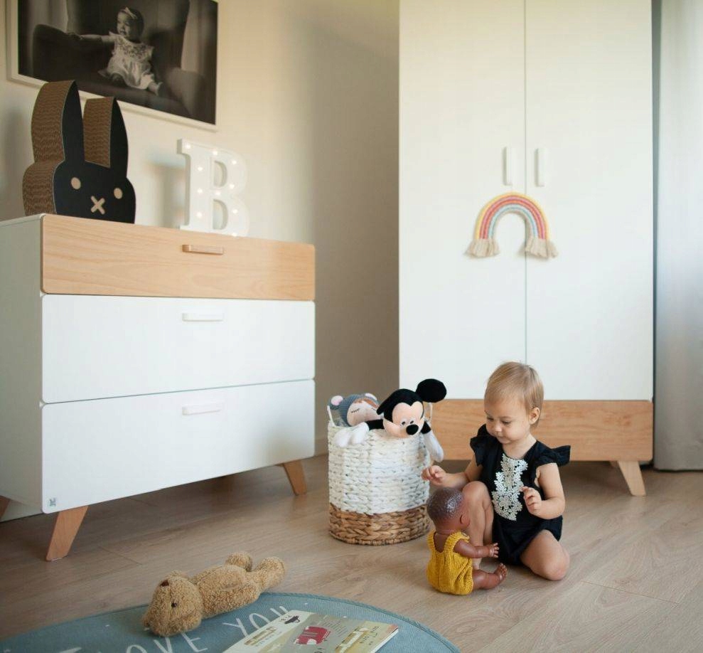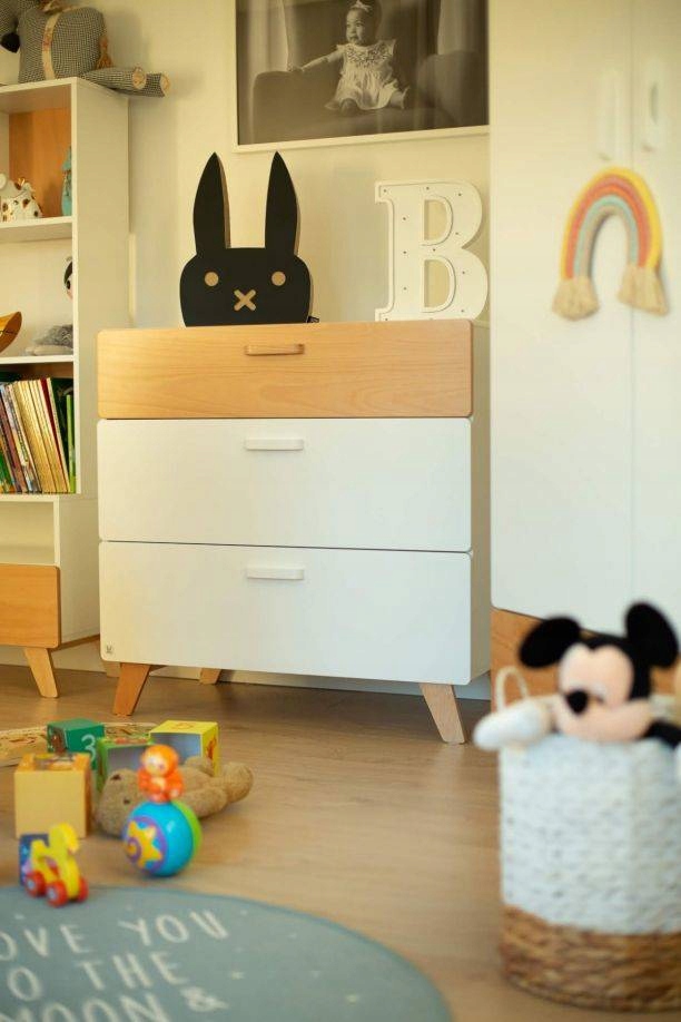 Форма комода, как и всей коллекции, слегка закруглена. Благодаря этому мебель более безопасна для ребенка (нет острых краев), а ее легкая форма идеально вписывается в скандинавский стиль. Стоит обратить внимание на пастельные тона, которые доминируют в коллекции. Сочетание белого цвета и натурального дерева делает мебель согревающей интерьер.