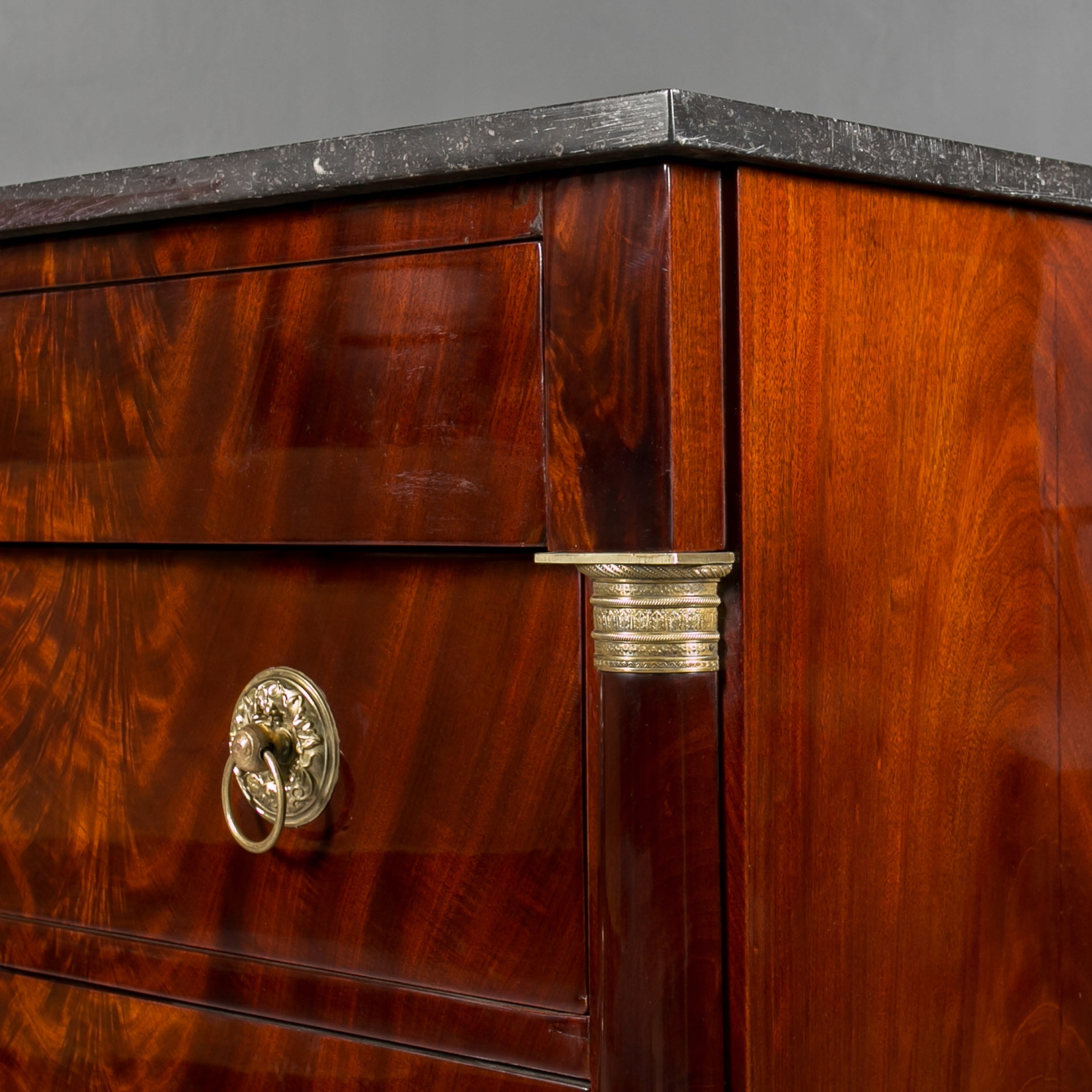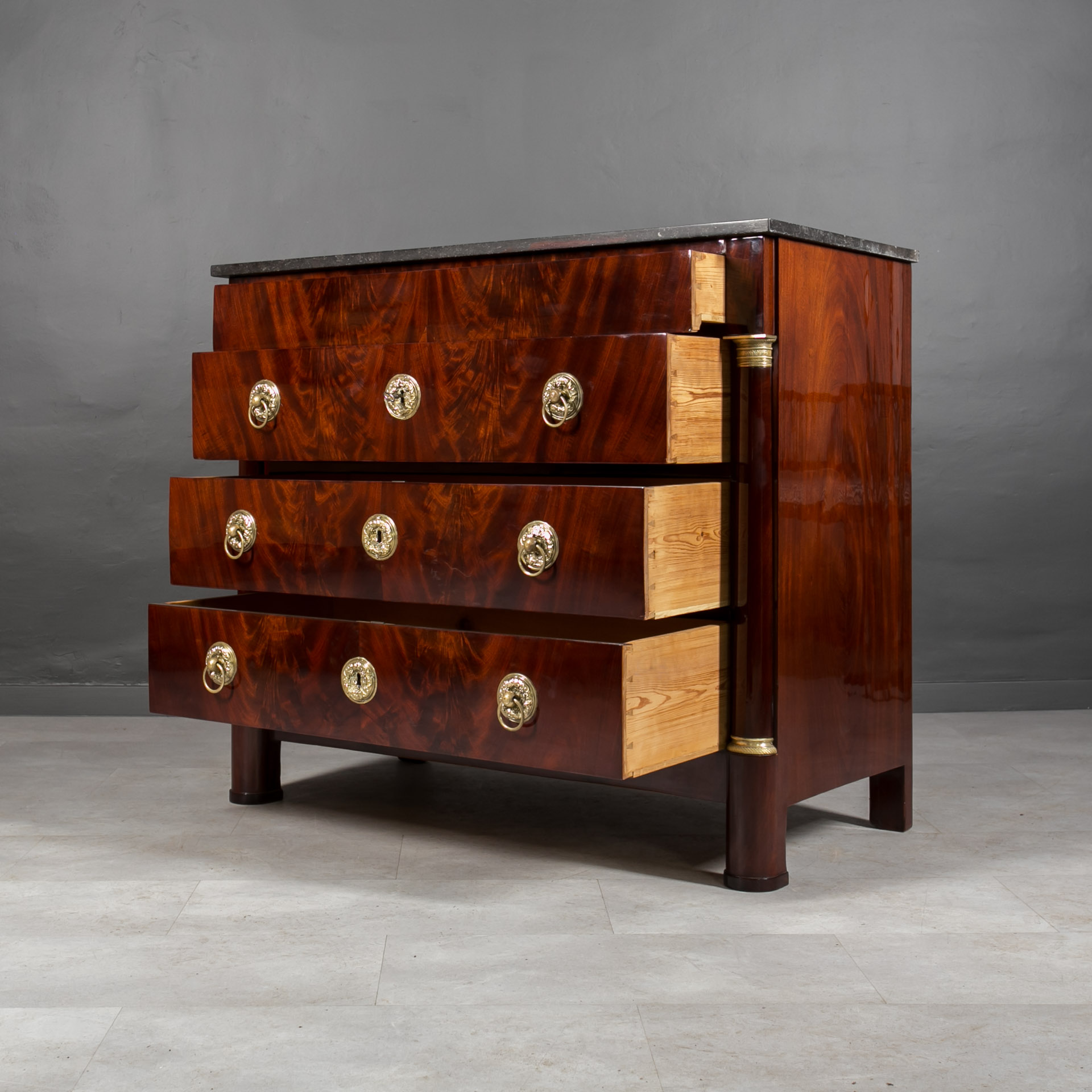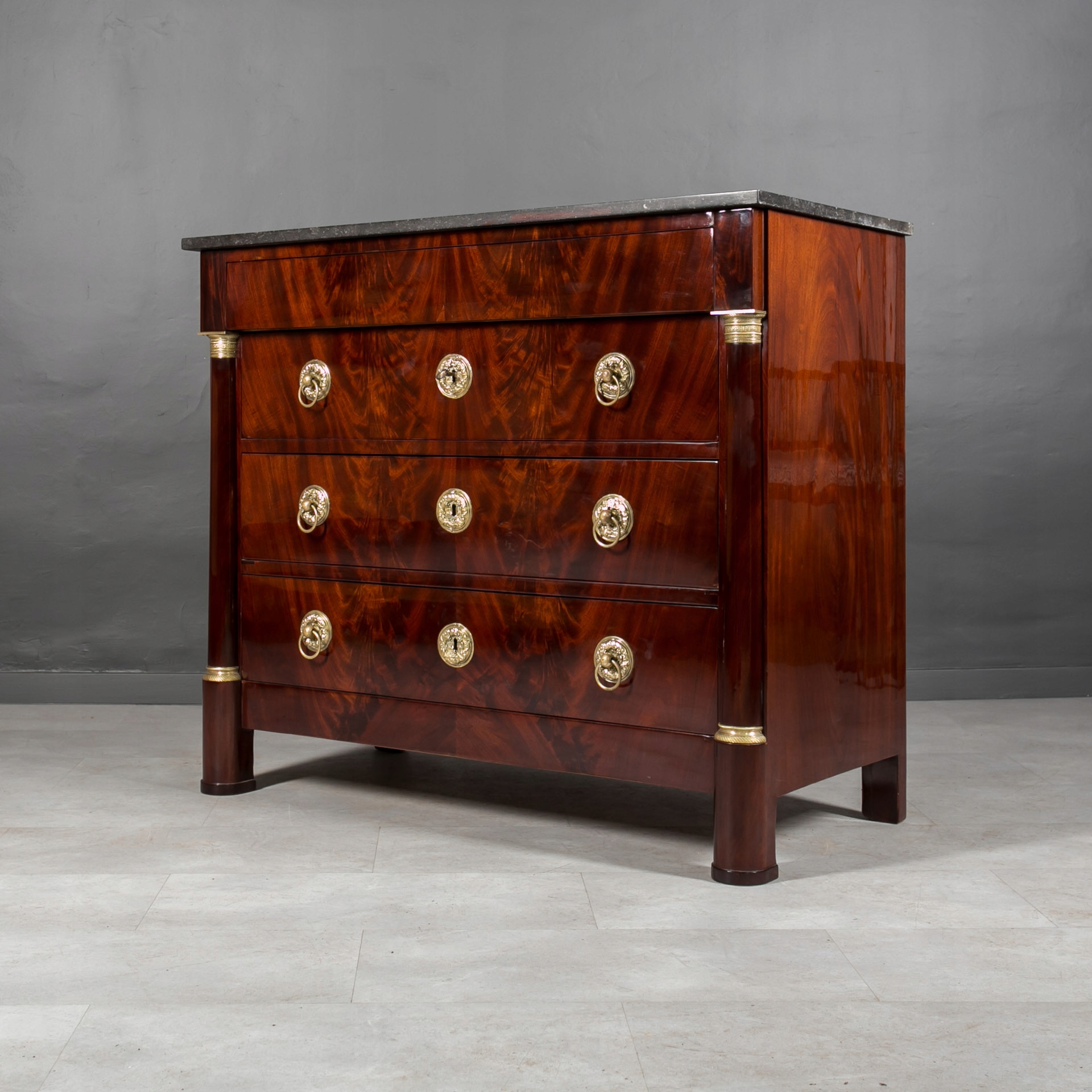 Мы рады предложить Вам на продажу комод периода Бидермейер. Мебель родом из Франции, а ее конструкция датируется 19 веком. Конструкция изготовлена из хвойного дерева, полностью облицована пирамидальным шпоном красного дерева. Комод с красивой оригинальной столешницей из белого мрамора, уникальными колоннами, украшенными латунными украшениями. В настоящее время в нашей мастерской мебель прошла процесс ремонта, в ходе которого мы отремонтировали элементы конструкции, заделали щели и починили замки. Поверхность покрыта шеллаком, нанесенным вручную с помощью тампона, который не только обеспечивает отличный визуальный эффект, но и защищает древесину и ухаживает за ней. Комод в очень хорошем состоянии, полностью функционален, готов к использованию.