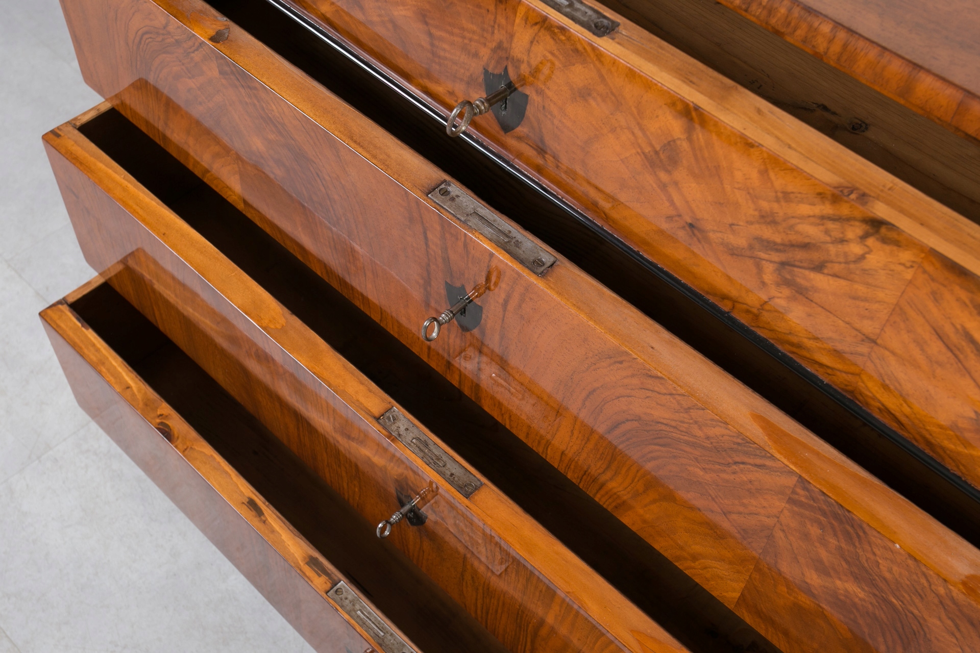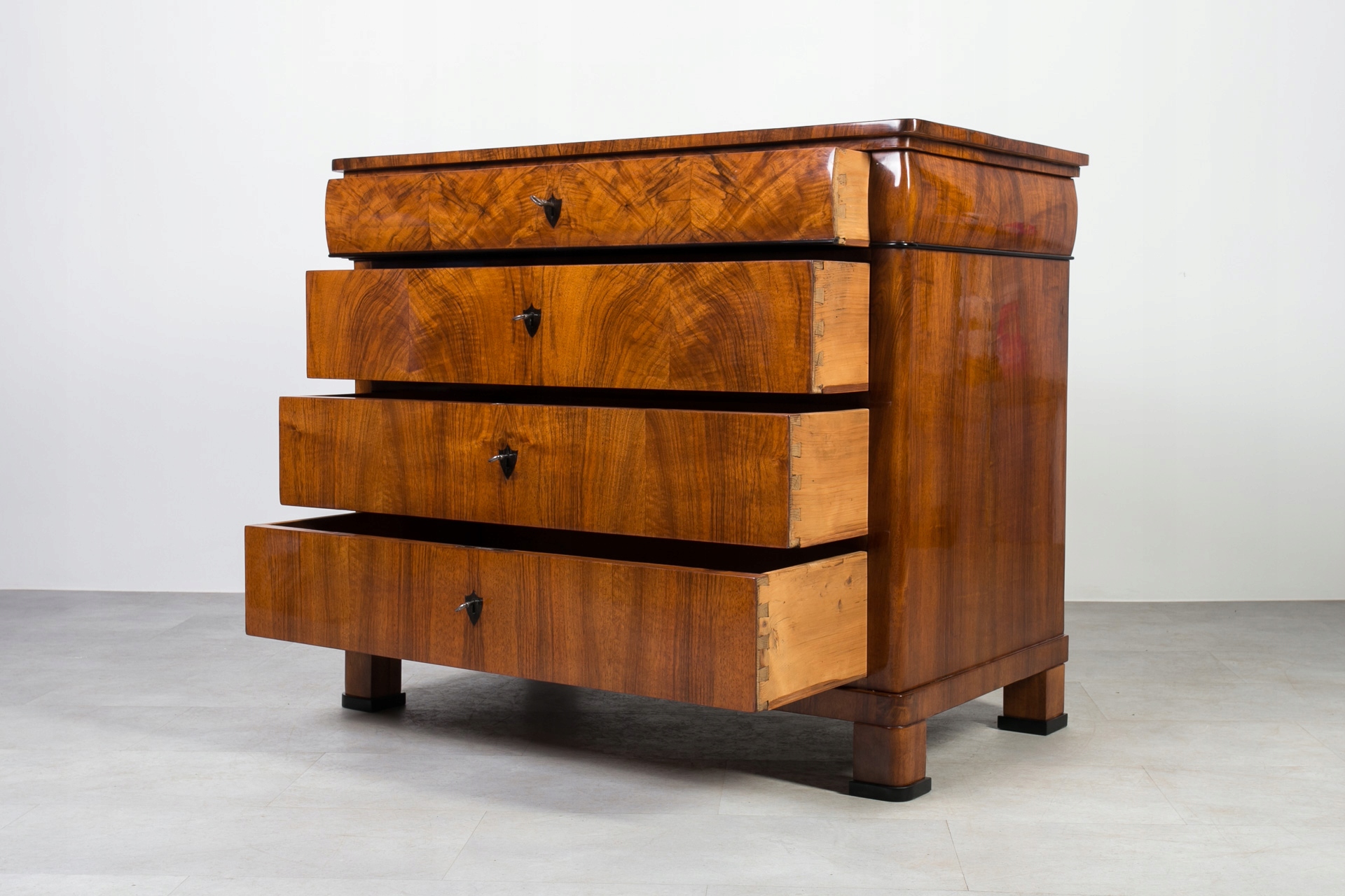 Комод в стиле бидермейер производства первой половины 19 века, Германия. Мебель изготовлена из массива дерева и отделана уникальным шпоном ореха, который подчеркивает ее элегантность и характер эпохи.