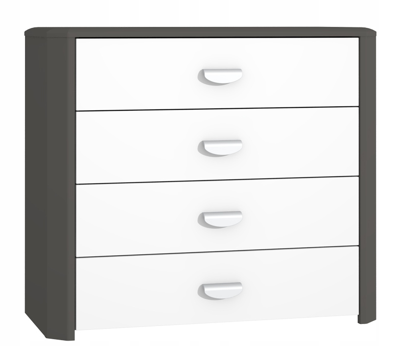 Комод из коллекции Hey привлекает внимание современным дизайном и модной расцветкой. Мебель выполнена в сочетании двух контрастных декоров: Matt Grey и White, что прекрасно дополняется декоративными ручками. В комоде имеется четыре ящика, в которых подросток может разместить школьные принадлежности, мелкие предметы одежды или различные гаджеты.