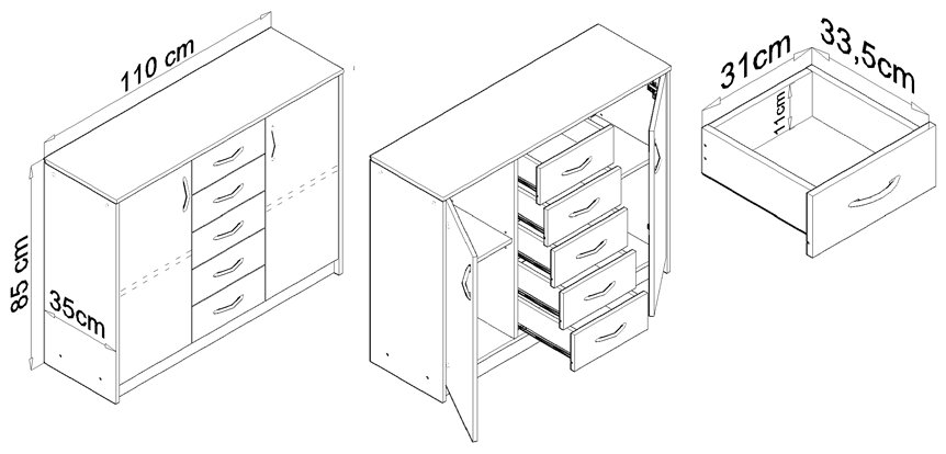 Комод 2D5S изготовлен из ламинированного картона очень хорошего качества толщиной 16 мм, который отличается повышенной прочностью. к царапинам и устойчивости к истиранию и влаге (возможна протирка влажной губкой).