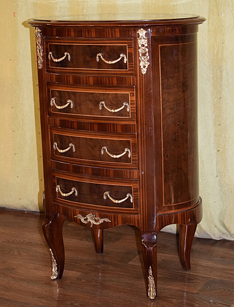 Современно выполнен из дерева в старинном стиле. Он имеет четыре ящика и украшен латунными ручками и украшениями. Цвет предмета мебели – темный орех.
