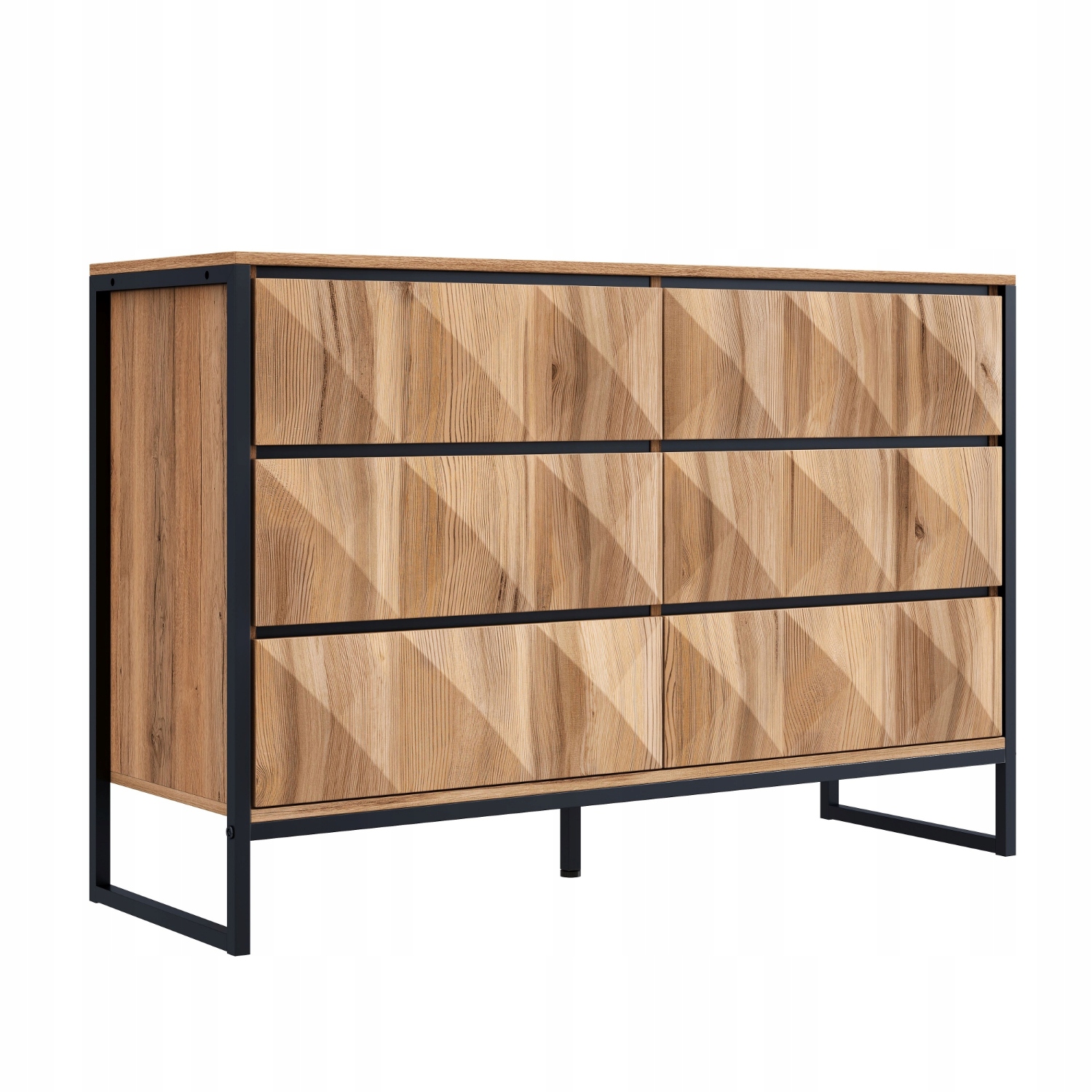 Этот современный комод прекрасно сочетает в себе практичность и стильный дизайн, что делает его одновременно красивым и функциональным — идеальный выбор для любого интерьера. Шесть вместительных ящиков обеспечат достаточно места для одежды, аксессуаров или предметов повседневного обихода, помогая поддерживать порядок в гостиной. Каждый ящик имеет элегантную черную декоративную планку, которая искусно скрывает ручку, подчеркивая минималистичный вид и простоту доступа. Главной особенностью этого комода являются уникальные фасады с выпуклым рисунком, создающим фактурный геометрический рисунок. Под воздействием солнечных лучей рисунок со временем визуально меняется, добавляя глубину и характер вашему интерьеру. Комод имеет прочный металлический каркас черного цвета, обеспечивающий долговечность и устойчивость. Текстура натурального дерева придает ему отчетливый индустриальный характер. Теплая текстура древесины дополняет прочную железную конструкцию, создавая сбалансированную и современную эстетику, которая идеально сочетается с различными стилями интерьера — от современного до индустриального. Независимо от того, разместите ли вы его в гостиной, спальне или холле, этот комод станет практичным решением для хранения вещей и стильным декоративным элементом. Чистые линии, натуральные материалы и художественные детали позволяют ему выделяться отдельно или идеально вписываться в дизайн интерьера. Для людей, которые ценят дизайн и практичность, этот комод станет идеальным выбором, поднимая повседневное хранение вещей на изысканный и современный уровень.