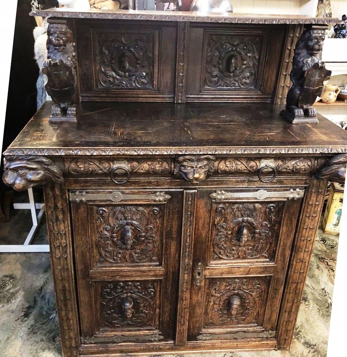 Комод/буфет из первой половины 18 век. Изготовлен из массива дуба в якобинском стиле, идеально подходит для коллекционеров антиквариата или тех, кто ценит ремесла. Замысловатая резьба, изображающая львов, солдат и лица ангелов, добавляет средневекового очарования. Комод имеет две дверцы, два ящика и две полки, что обеспечивает достаточно места для хранения всех ваших вещей. Дверцы с приподнятыми панелями и латунные ручки ручной работы делают этот шкаф уникальным. Все элементы, петли, замки и ключ оригинальные той эпохи.