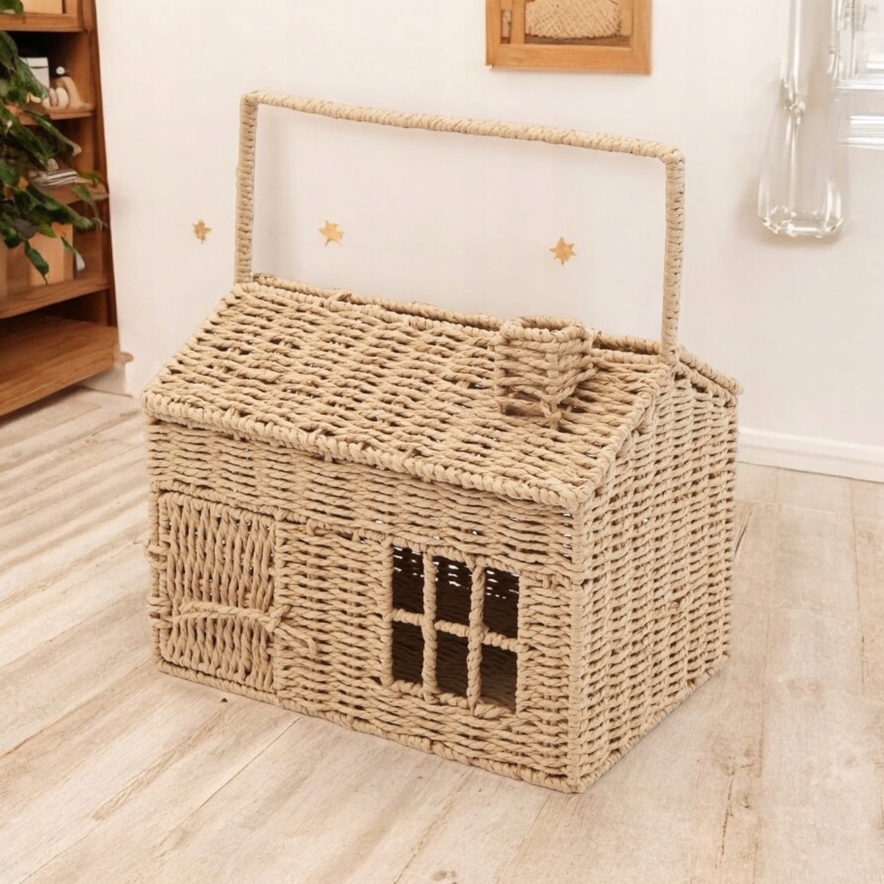 Домик имеет ручку, открывающиеся с двух сторон створки крыши и открывающуюся дверь.