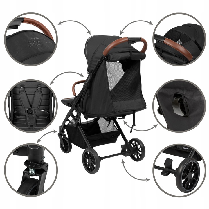Коляска оснащена удобной и вместительной корзиной, в которой можно разместить множество необходимых вещей, необходимых во время прогулок.