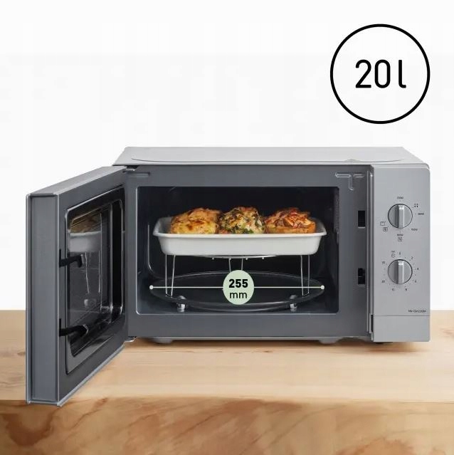 Благодаря компактным размерам 440 x 333 x 258 мм (Ш x Г x В) эта микроволновая печь поместится где угодно, даже на маленькой кухне. Емкость 20 литров и стеклянная тарелка диаметром 255 мм позволят разместить тарелки большего размера и стандартную посуду.