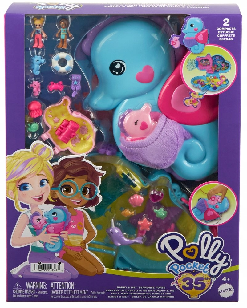 Polly Pocket Seahorses — компактный набор, который позволит вам погрузиться в мир морских приключений. Маленький розовый морской конек спрятался в плюшевом мешочке на животе матери. Откройте сумку и откройте для себя пляжную сцену, с которой можно поиграть.