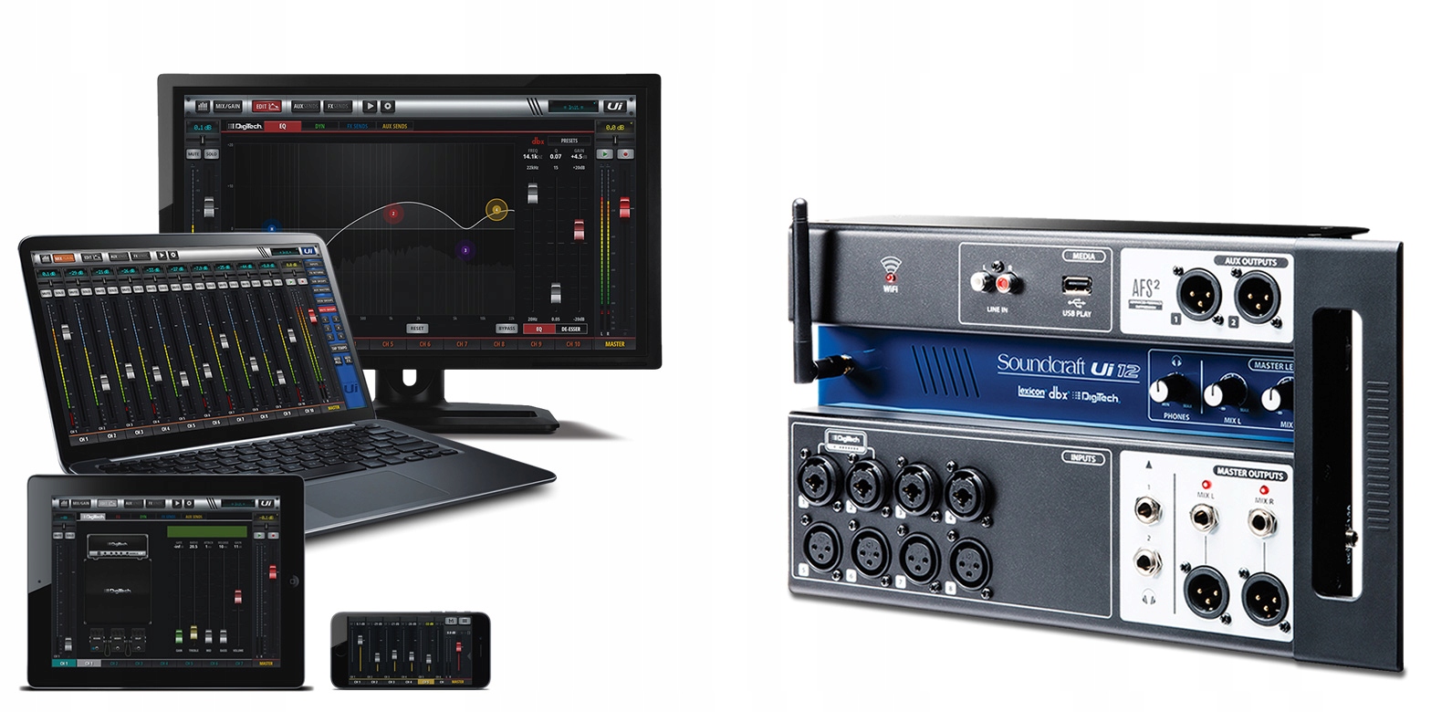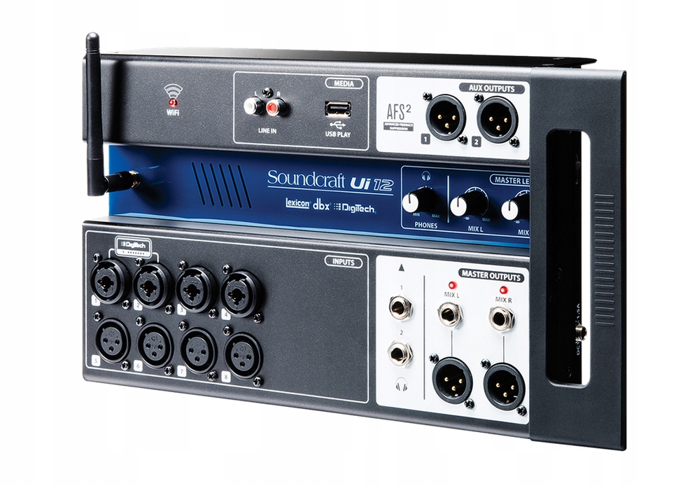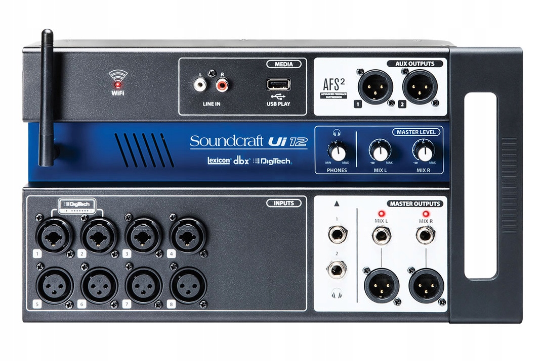 В случае с младшей моделью Ui12 меньше только количество комбо-входов, которое равно 4. Микшеры также оснащены 2-канальным проигрывателем файлов с USB-накопителя, совместимым с MP3, WAV и AIFF. форматов, а также четыре балансных выхода AUX в виде разъемов XLR, два выхода для наушников с регулировкой уровня, а также балансный основной стереовыход XLR и разъем TRS 1/4 дюйма.