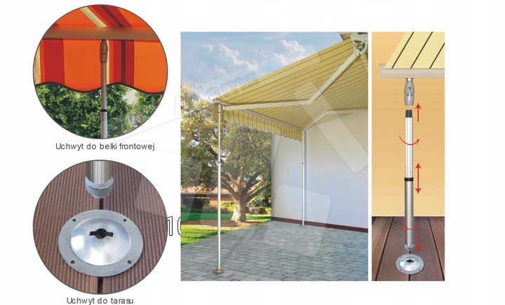 Атент за дополнительную плату может быть модифицирован с помощью поддержки защиты ветра. Быстрая сборка и разборка. Регулируемая высота от 150 до 250 см. Они позволяют вам использовать навесы во время ветра. Не рекомендуется для Awnings с электрическим приводом. Не используйтесь для Awnings с датчиком ветра.