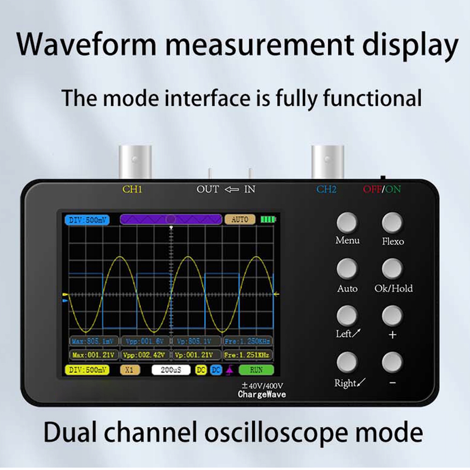 - Функция отображения измерения волны, 3,2-дюймовый ЖК-дисплей, разрешение 320*240, три режима отображения, можно легко настроить на режим двухканального осциллографа, модель XY и отображение формы сигнала.