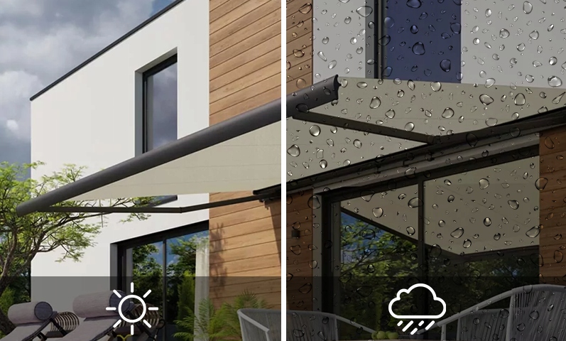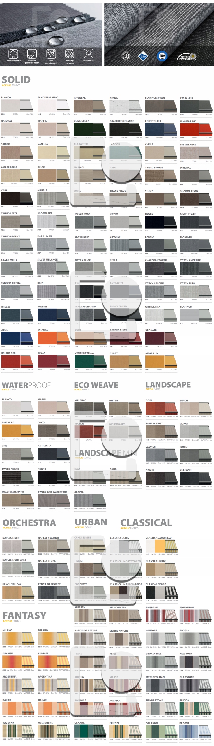 Предлагаемые акриловые ткани покрыты тефлоном, что обеспечивает им защиту от воды. При выборе стандартной ткани вам не нужно беспокоиться о мимолетном летнем дожде, вода будет течь вниз, и вы все равно сможете использовать моменты на террасе.