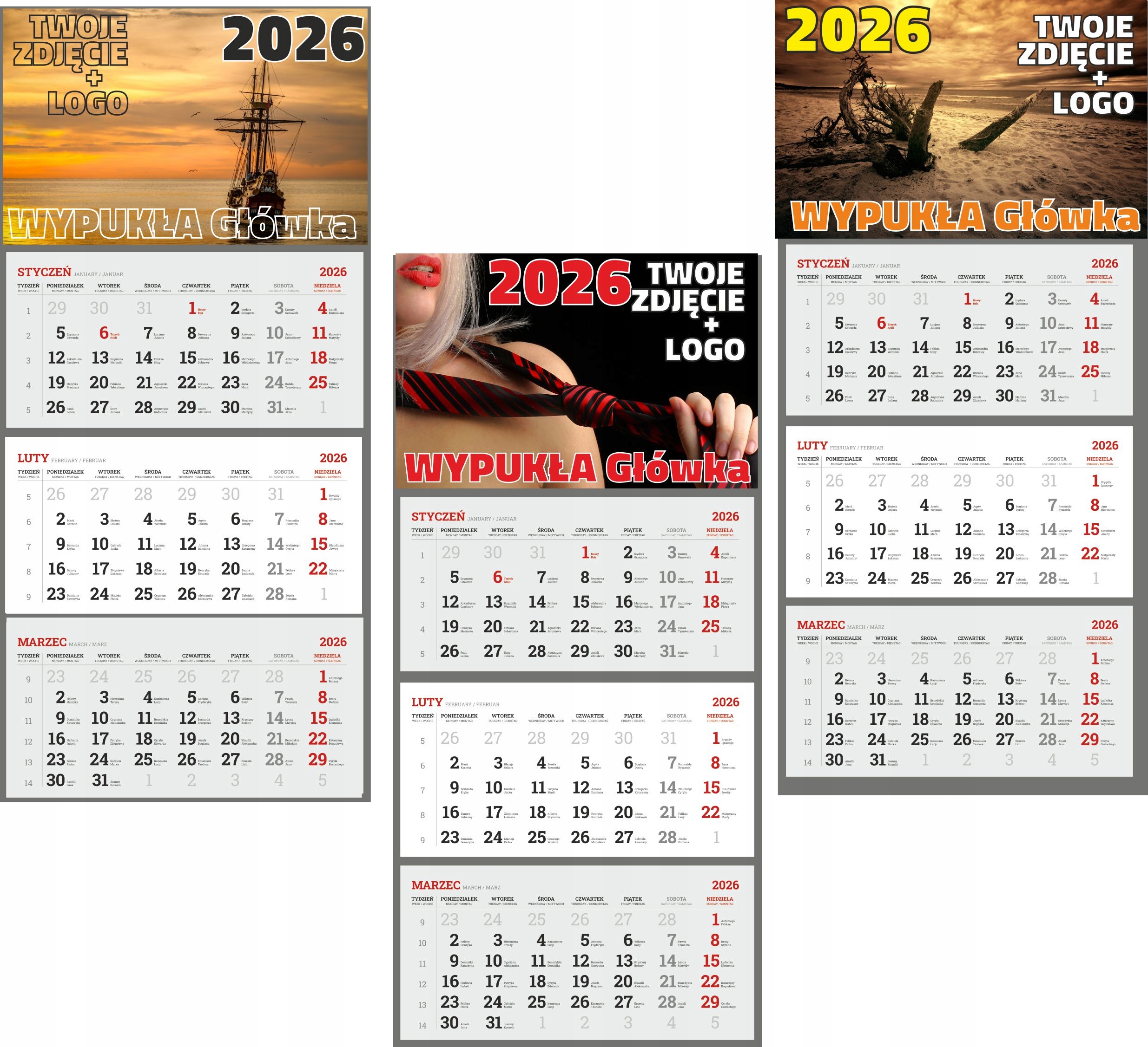 Голова календаря напечатана в полном цвете , что позволяет создавать любой графический дизайн, размещение персонажей компании, фотографий, текстов в любых цветах. Подложка, используемая для печати, представляет собой специальное картон Аляски с весом 250 г, что гарантирует очень хорошее качество цвета . Добавление используемой флэш -фольги явно оживляет цвет и в то же время увеличивает долговечность календаря. В верхней части головы есть отверстие, которое позволяет вам приостановить календарь. Верхний край календаря дополнительно потерян и приклеен, что укрепляет его жесткость. В середине календаря, над календарем, большая линия работает, благодаря которой легко сложить пополам. Головы прикреплены к голове в нейтральном сером цвете .