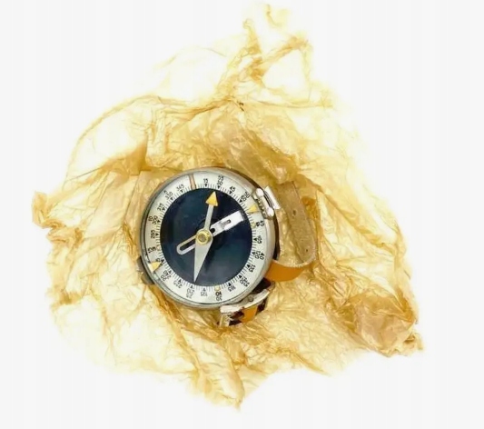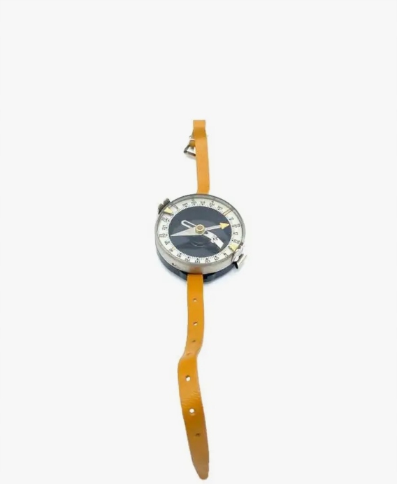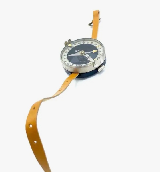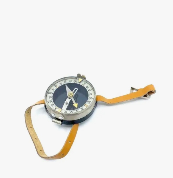 Ручной компас Адрианова, армия, СССР. Компас с фосфоресцентным освещением состоит из корпуса, в центре которого на кончике иглы размещена магнитная стрелка. Когда игла не тормозится, ее северный конец ориентирован на северный магнитный полюс, а южный конец - на южный магнитный полюс. Когда индикатор не используется, он фиксируется тормозом (замком). Внутри корпуса компаса имеется круглая шкала (циферблат), разделенная на 120 делений. Одно деление — это 3 или 50 малых делений транспортира (0 50). Весы имеют двузначную цифру. Внутренняя оцифровка применяется по часовой стрелке от 0 до 360 в 15 (5 делений шкалы). Внешняя оцифровка шкалы происходит в направлении против часовой стрелки через 5 больших делений транспортира (10 делений шкалы). Для возможности наблюдения за местными предметами (ориентирами) и снятия показаний по шкале компаса к вращающемуся кольцу компаса крепятся прицелы (мушка и мушка) и индикатор показаний. Производство СССР 1980 - 1990 гг. Есть в наличии.