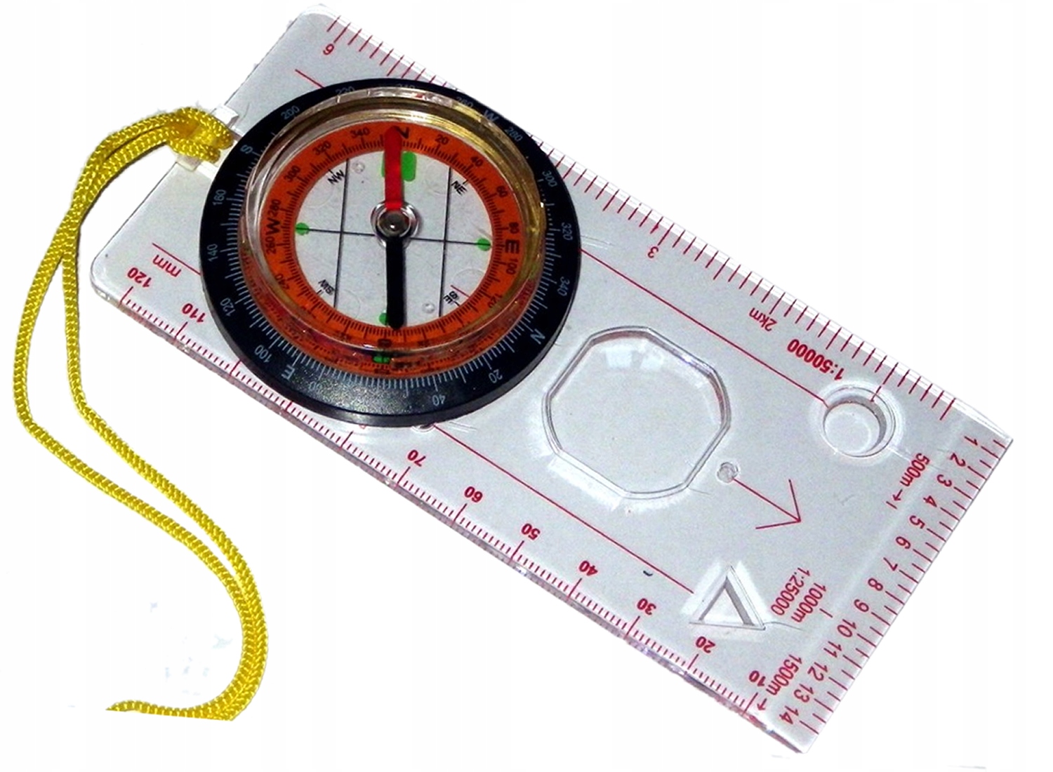 Компас в виде фрагмента карты. Идеально подходит для участия в соревнованиях по спортивному ориентированию. На пластине представленымасштабы различных карт; 1:25000 (1см=250м) и 1:50000 (1см-500м). Линейка имеет функцию отсчета полных масштабов, например 1:10 000 (1 см линейки равен 100 метрам в поле - посмотрите на компас). Благодаря прозрачности таблички можно легко работать по карте и определять азимут для перехода от точки А к Б. Подвижная шкала на циферблате компаса (от 0 до 360 градусов), позволяет считывать азимут, пеленг точек или содержимое карты во время ходьбы/бега. Компас следует держать горизонтально, чтобы циферблат мог свободно вращаться (вращение или наклон компаса может привести к блокировке стрелки). Красная стрелка показывает направление на север. Хороший и простой компас для участия в соревнованиях по спортивному ориентированию и занятий квалифицированным туризмом. Стрелка компаса подвешивается в спиртовом растворе на специальном штыре, что позволяет работать при минусовых температурах. Время стабилизации иглы примерно 2–3 секунды. Для работы с картой в компасе имеется лупа, которая всегда поможет прочитать топографические детали.