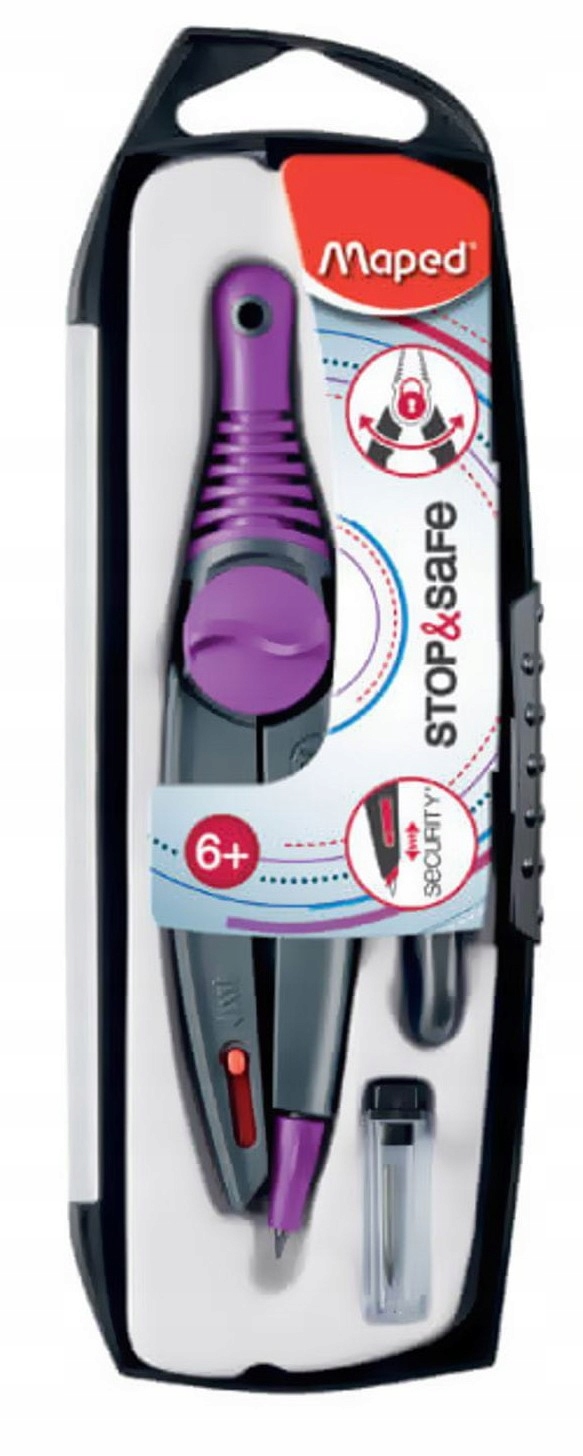 компасы STOP&SAFE с усовершенствованной системой безопасности. Игла автоматически втягивается при закрытии рычагов. Эргономичная прорезиненная ручка предотвращает выскальзывание из руки. Можно зафиксировать рычаги компаса в определенном положении. В набор входит деревянный карандаш. Микс трех цветов: синего, фиолетового и красного. JS 1 шт.