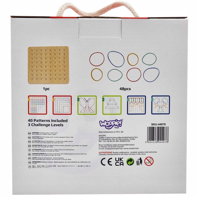Это развивающая игра, развивающая творчество и воображение. Набор состоит из 48 резинок и 20 двусторонних карточек с 40 узорами различной степени сложности (3 уровня). В этой игре дети пытаются воссоздать изображение на карточке с помощью ластика – создавая контуры различных форм, например рыбки. Развлечение может быть развлечением. разнообразить, играя в b>запоминание и воспроизведение картинки по памяти малышом. Ребёнок также может придумать свою форму/фишку – это ограничивается только творчеством и фантазией. Игрушка развивает мануальные навыки и < б>логическое мышление, воображение и творчество, концентрация и память.