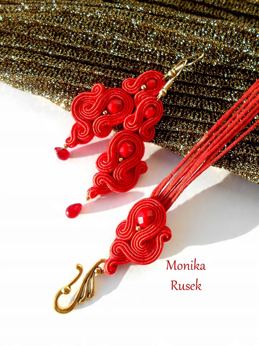 Браслет и серьги изготовлены из струн высшего качества, красных кристаллов, стеклянных капель, мелких гематитов золотого цвета и тонких вощеных струн толщиной 1 мм. Серьги подвешены на швензах из хирургической стали. Комплект тщательно отделан тонким фетром, подобранным по цвету и пропитанным, что существенно предотвращает загрязнения.