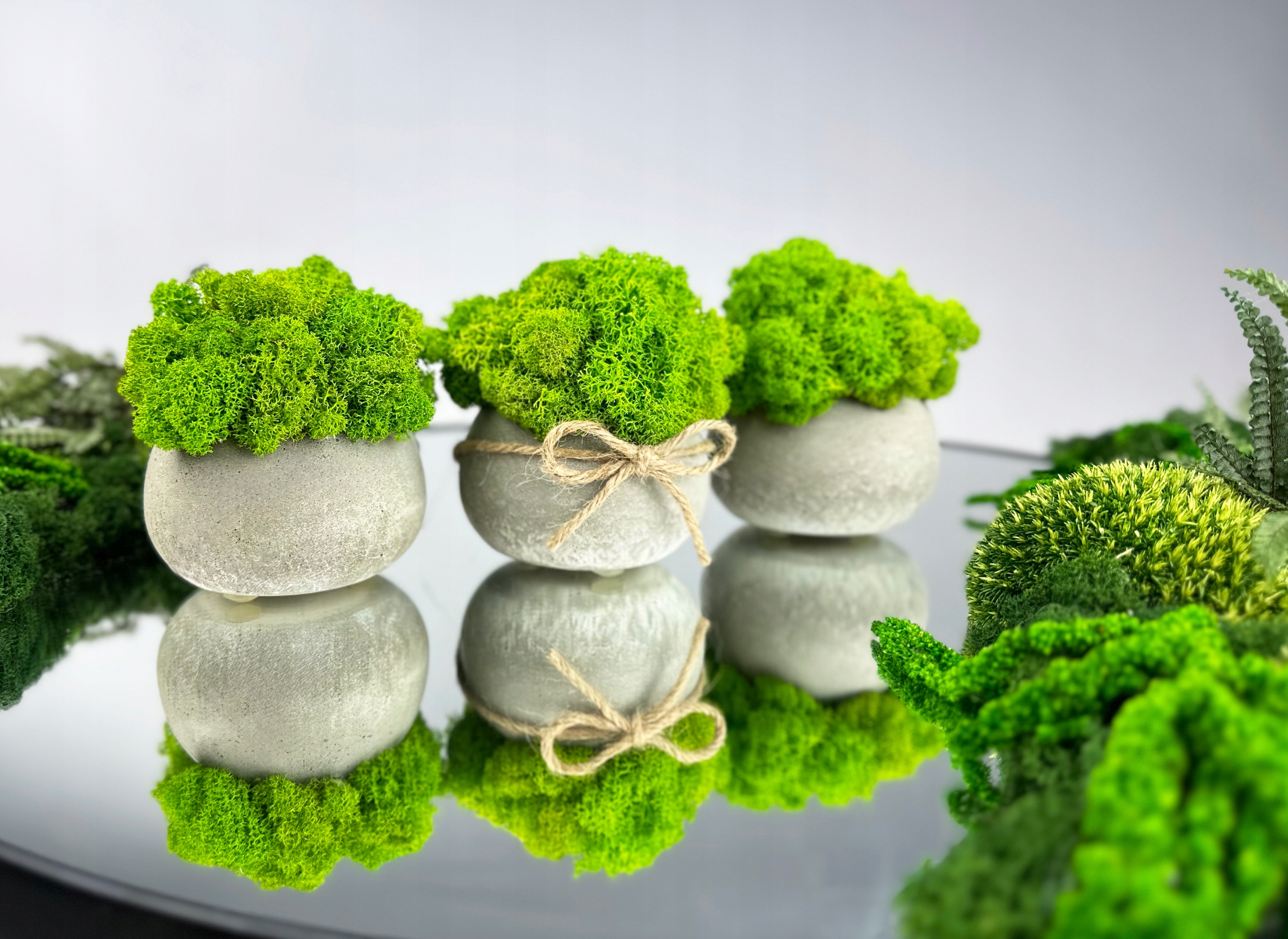 Горшки круглой формы, тонкая текстура бетона и индустриальный характер создают идеальный контраст с яркой зеленью мха.
