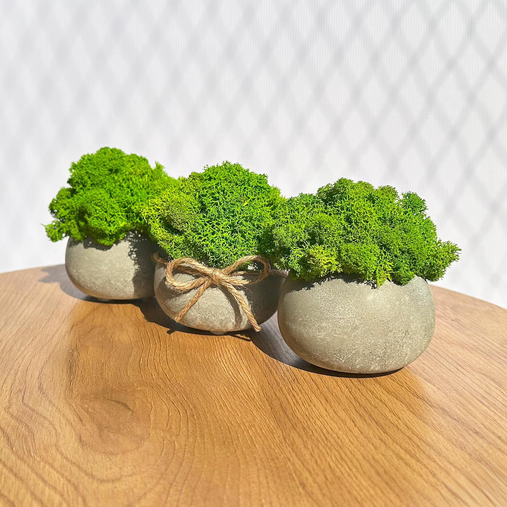 TRIO MOSS - это больше, чем просто украшение - это уникальная работа искусства, которое добавит в ваш интерьер гармонию природы и современного стиля. Каждый из трех горшков в этом наборе тщательно изготовлен из архитектурного бетона и наполнен живым финским мхом, создавая совершенно уникальный декоративный элемент, который вы больше нигде не найдете.