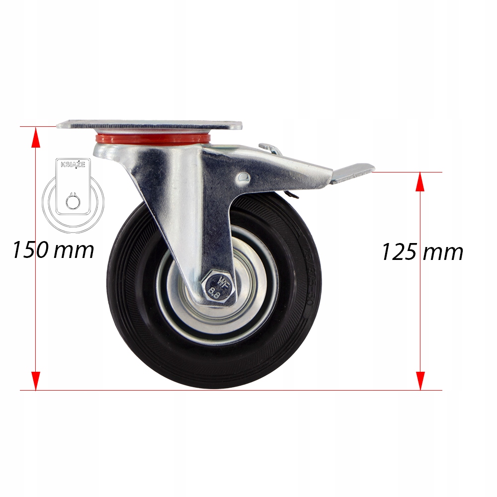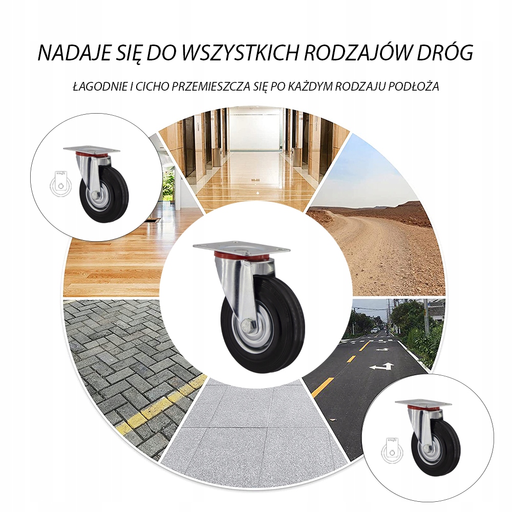 - КОЛЕСО состоит из стальной ступицы и немаркирующей резиновой шины, имеет игольчатый подшипник. Колеса имеют прочность 100 кг на колесо. Они медленно изнашиваются, устойчивы к повреждениям, поглощают удары и вибрации. Они вращаются на 360 градусов, что облегчает маневрирование мебели или коляски. Они плавно катятся по твердым и гладким поверхностям, таким как бетон, с минимальным трением.
