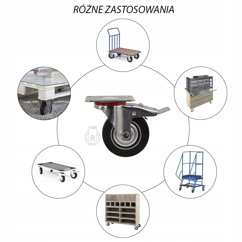 - КОЛЕСО состоит из стальной ступицы и немаркирующей резиновой шины, имеет игольчатый подшипник. Колеса имеют прочность 70 кг на колесо. Они медленно изнашиваются, устойчивы к повреждениям, поглощают удары и вибрации. Они вращаются на 360 градусов, облегчая маневрирование мебели или коляски. Они плавно вращаются на твердых и гладких поверхностях, таких как бетон, с минимальным трением.