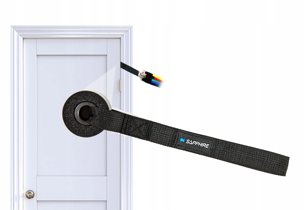 - Дополнительным элементом комплекта является дверной анкер, позволяющий смонтировать устройство практически в любом помещении без использования дополнительных крепежных элементов (шурупы, и т. д.). Вшитый в якорь элемент с мягкой отделкой позволяет запереть его с другой стороны закрытой двери. Это решение позволяет выполнять последующие комплексы упражнений.