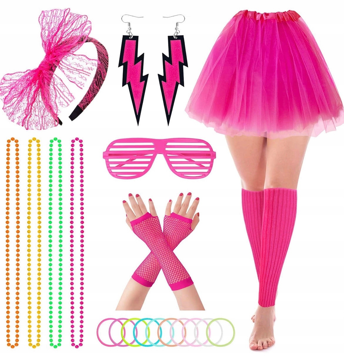 НАРЯД 80-Х НЕОН НАБОР СЕРЬГИ ОЖЕРЕЛЬЕ ЮБКА ДИСКО ПЕРЧАТКИ 8в1