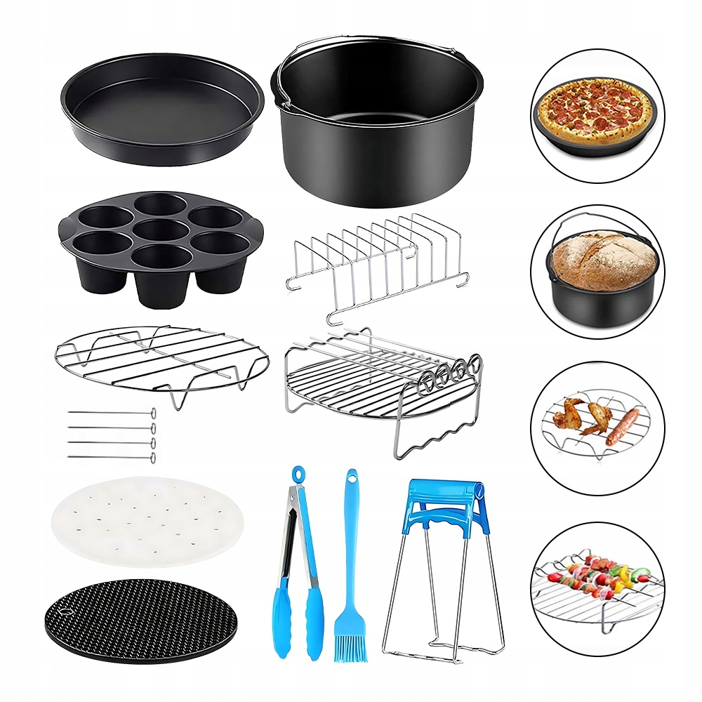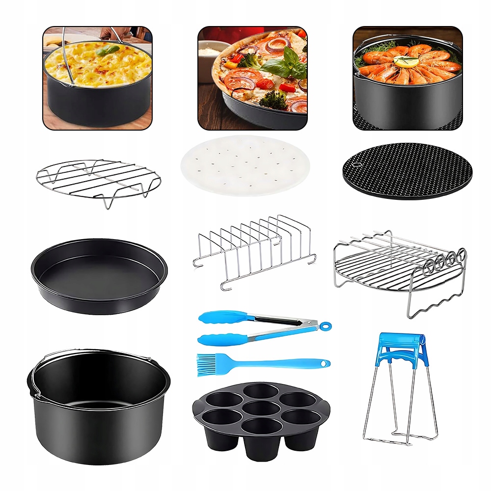 Набор аксессуаров для аэрофритюрницы позволяет в полной мере использовать свое воображение и творческий потенциал для создания широкого спектра вкусных блюд, таких как торты, пицца, картофель фри, шашлык, пончики, куриные ножки, куриные крылышки и многое другое.