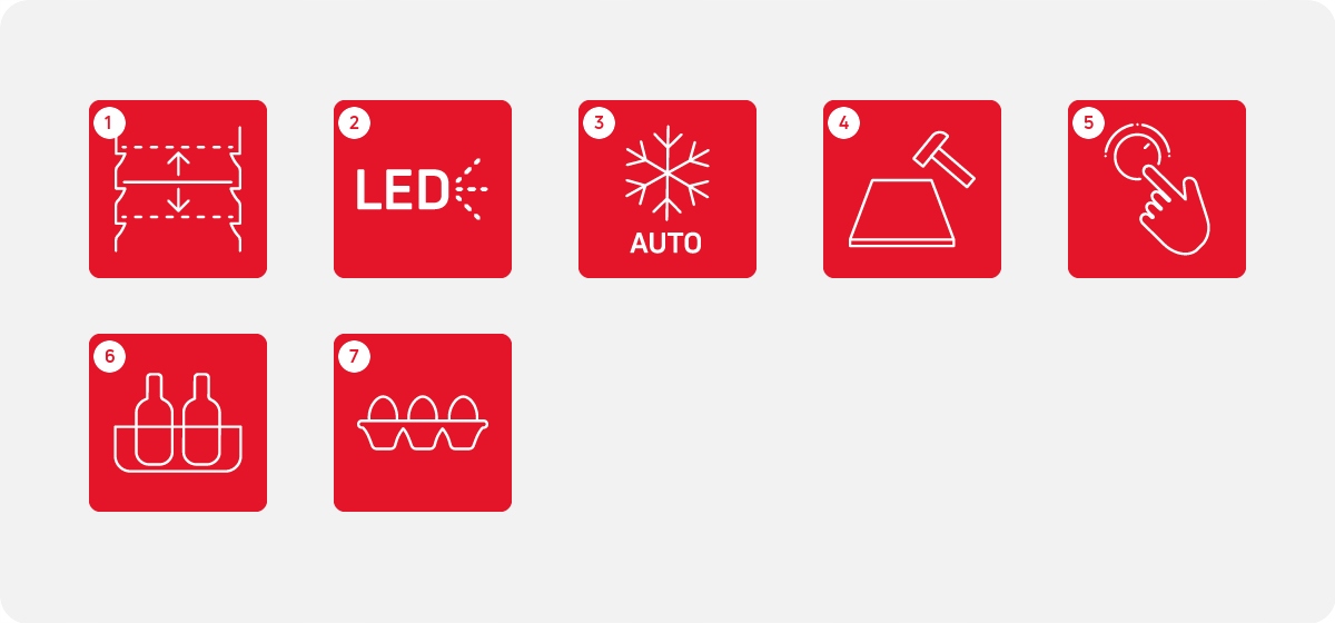 Набор полочек на дверце холодильника, идеально подходящий для безопасного хранения небольших продуктов, баночек или бутылок. Теперь вы всегда будете знать, где что находится - и будете иметь к этому удобный доступ.
