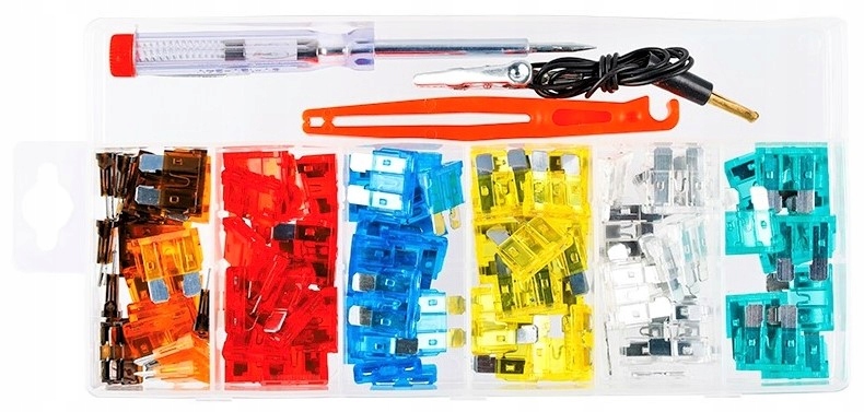 - Пластинные предохранители UNI в комплекте с универсальным тестером, предназначенным для определения напряжения в диапазоне 6-24В. В комплект входит специальный захват.