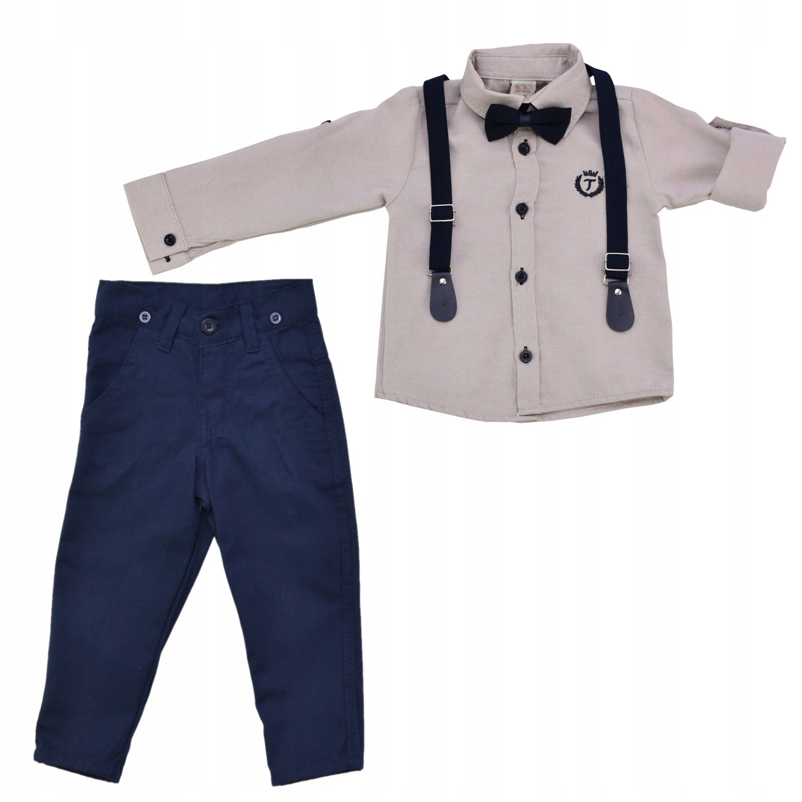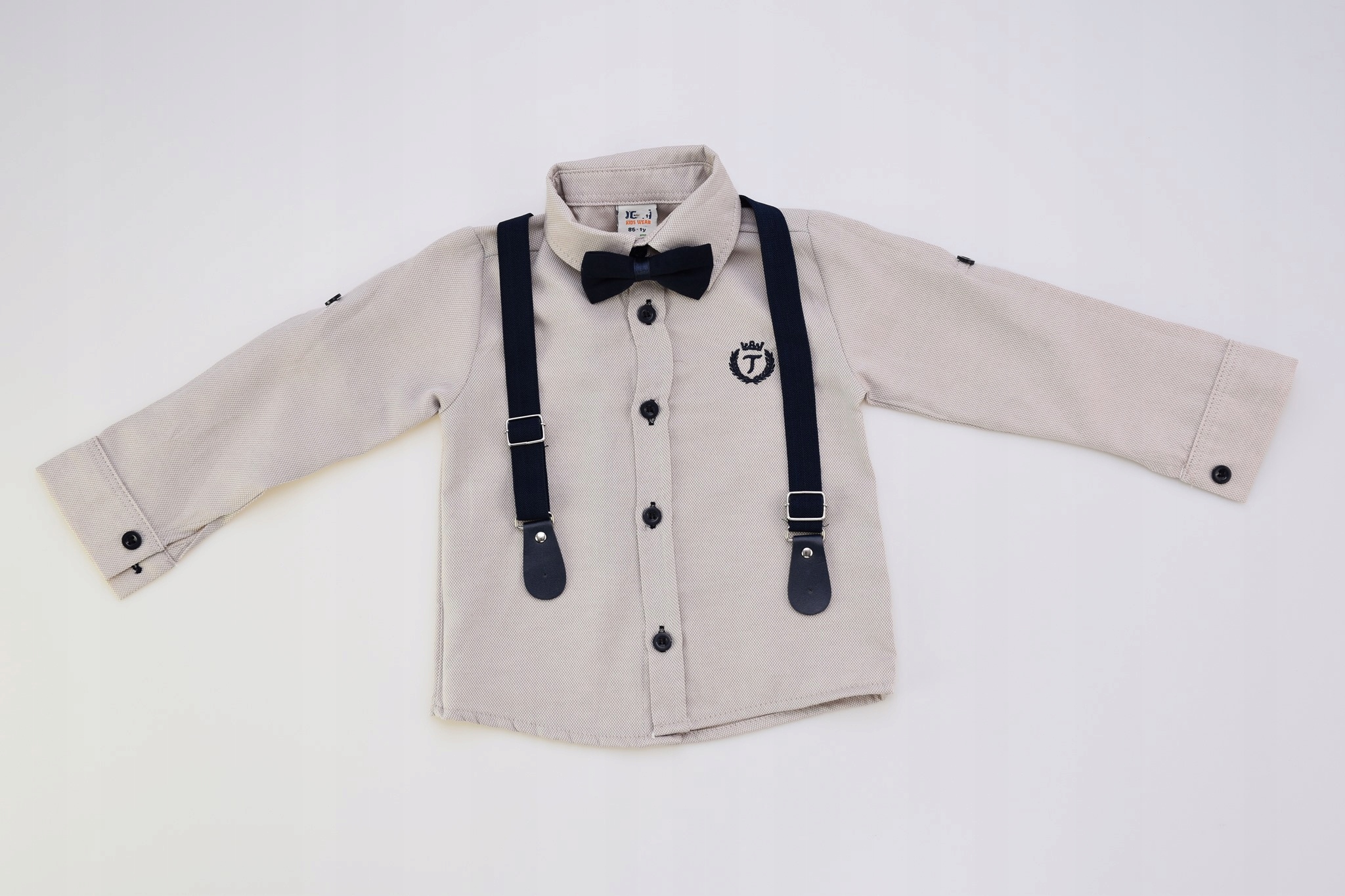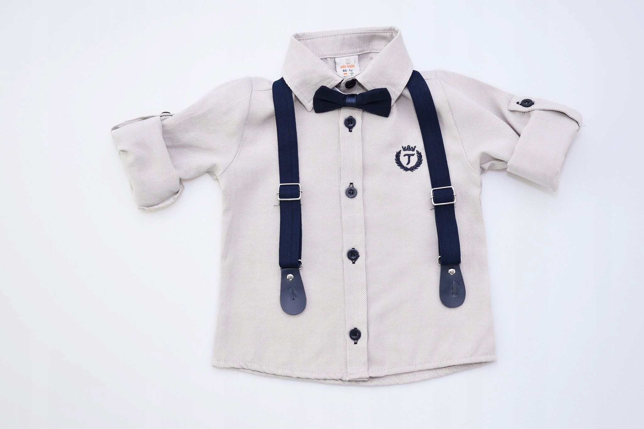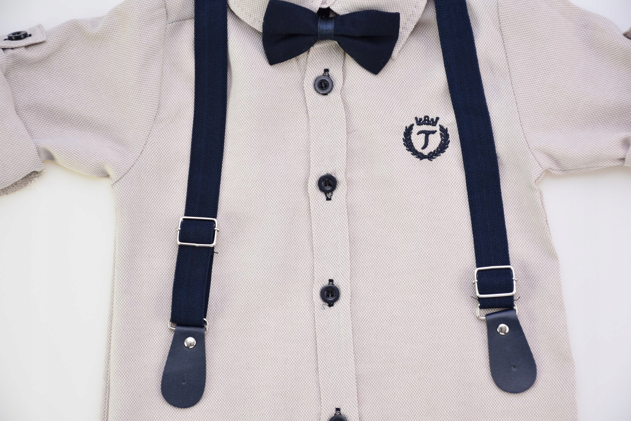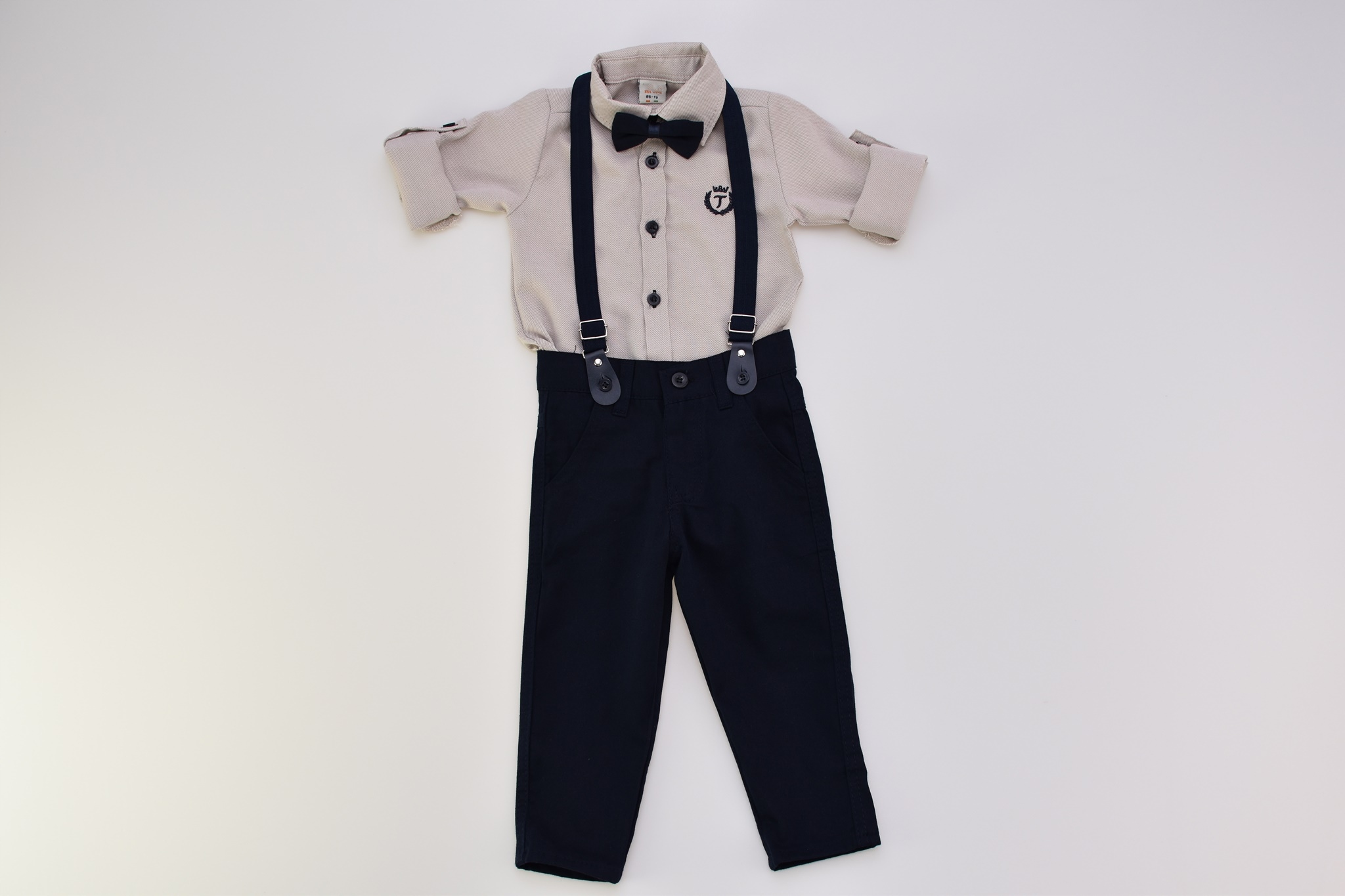 Элегантный комплект состоит из рубашки с галстуком-бабочкой и брюк на подтяжках